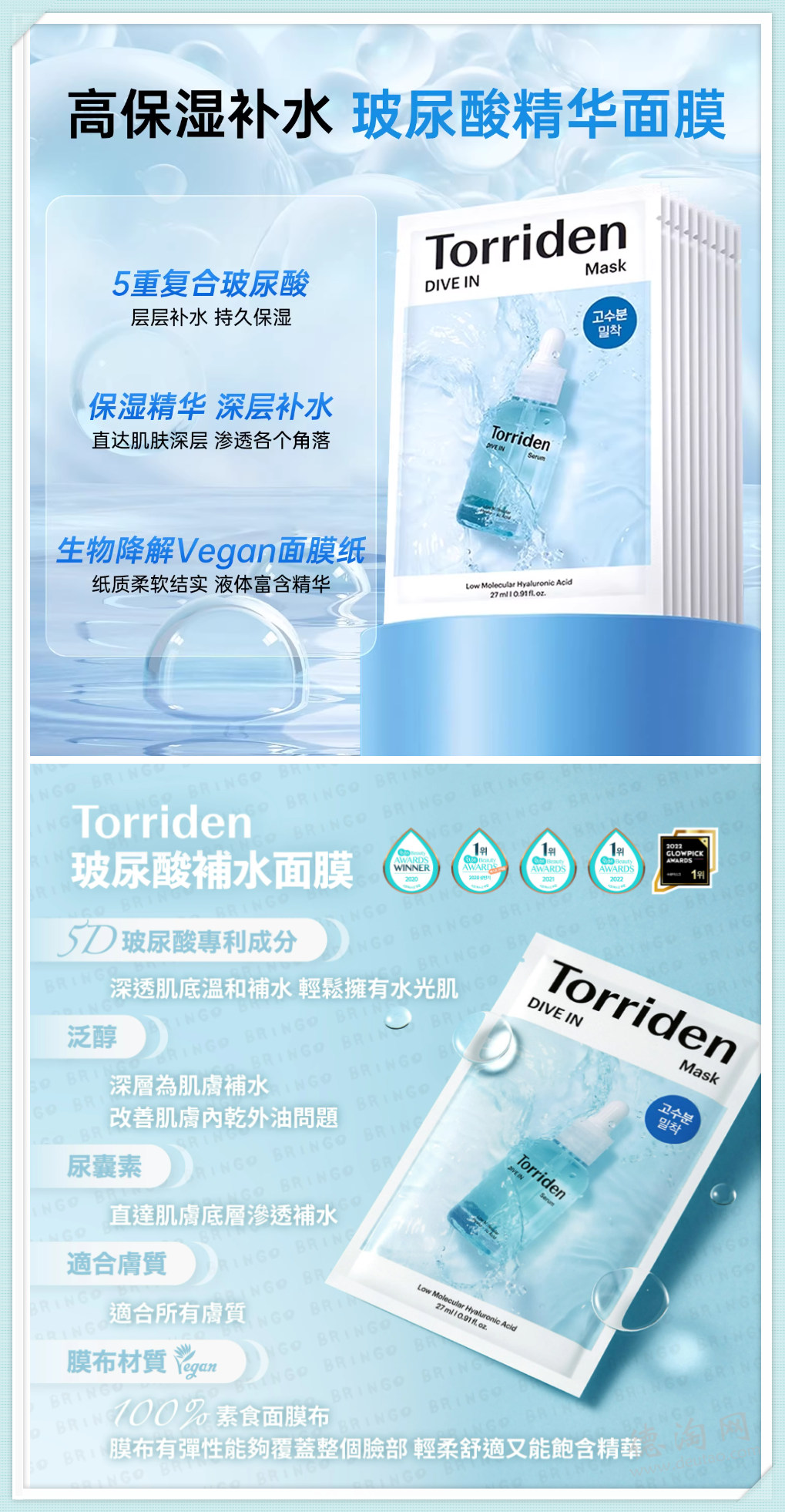 • 【Torriden DIVE IN 5D玻尿酸面膜10片 特价仅30欧!】 最受欢迎的王牌系列面膜!采用五种低份子透明质酸及洋甘菊提取物等成份,通过皮肤刺激测试,天然且没有人造色素香料,孕妇敏感肌肤也可用,迅速为肌肤保湿和锁住水份,同时形成保湿保护膜。