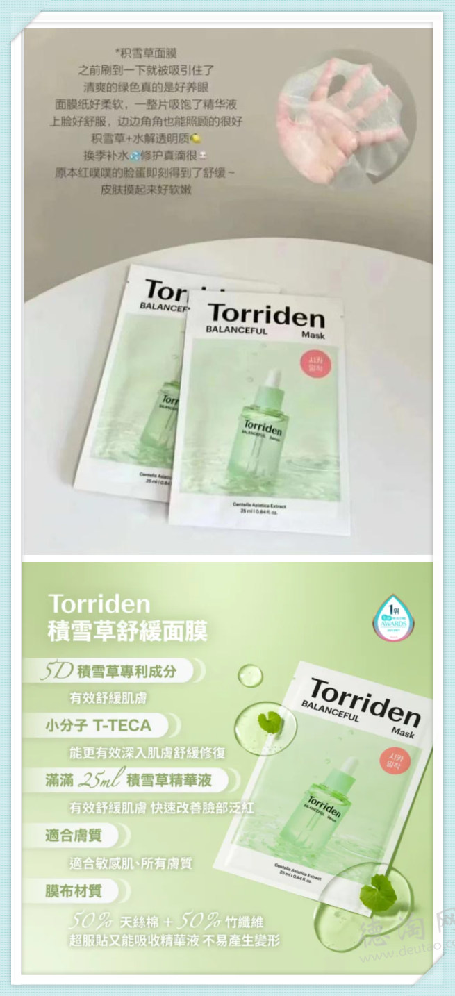 • 【Torriden BALANCEFUL积雪草面膜10片 特价仅30欧!】 另一款人气国民面膜,比起玻尿酸更适合问题肌!采用5D复合积雪草提取物,清爽保湿不油腻,面膜轻薄且贴面,能够瞬间为肌肤补水、急救,并渗透皮肤底层,快速为皮肤镇静,有效改善暗疮、舒缓泛红抗敏感肌肤!