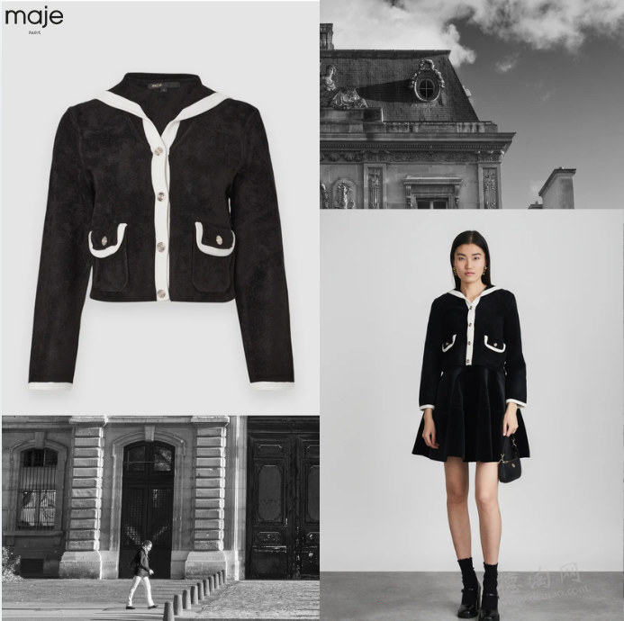 • 【Maje 拼色针织开衫 折后仅125欧,原价265欧!】 在极简黑色中加入白色锁边层次,让整体更有设计感,而不是单调。恰到好处的短款长度,落在腰线位置,视觉上自然拉长腿部比例。利落的翻领让针织不再只是温柔单品,而多了一层结构感与正式感。柔软与挺括在这里达到平衡。