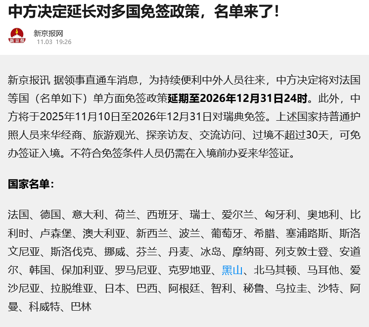 11月3号消息,为持续便利中外人员往来,中方决定将对法国等国(名单如下)单方面免签政策延期至2026年12月31日24时。此外,中方将于2025年11月10日至2026年12月31日对瑞典免签。上述国家持普通护照人员来华经商、旅游观光、探亲访友、交流访问、过境不超过30天,可免办签证入境。不符合免签条件人员仍需在入境前办妥来华签证。