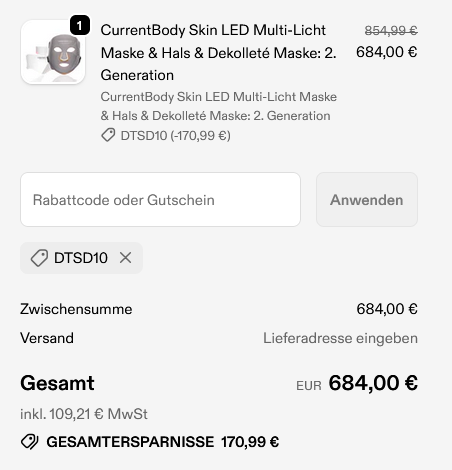★ 输入优惠码方法:选择商品,放入购物车,点击黑色按钮(DEBIT/KREDIT或者Zur Kasse),跳转到支付页面,就会出现可以输入优惠码的页面!