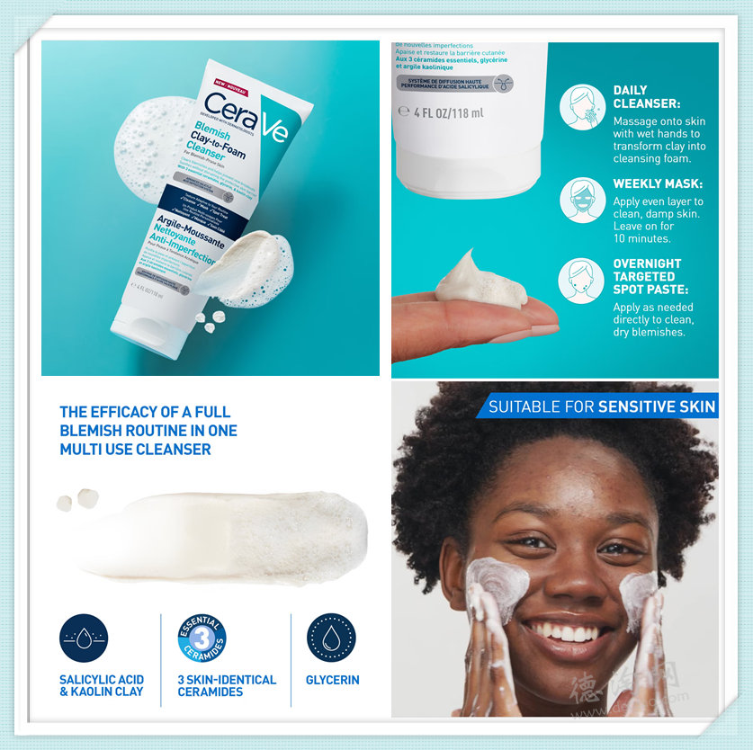 专为易长痘肌肤打造,将净化、焕肤与修护融为一步,为肌肤重建清爽而稳定的状态。质地由泥转泡,触肤即化。它在深层吸附多余油脂与杂质的同时,保持肌肤屏障的完整与舒适。有效成分2%水杨酸,有效去除瑕疵,预防痘痘再发。三种必需的神经酰胺帮助保持肌肤水分,修复和强化肌肤屏障。甘油能够持续保湿达24小时,舒缓肌肤。使用方式三合一使用,日常清洁用作日常洗面乳。每周面膜作为深层清洁面膜使用。更可用作夜间护理产品,针对性地处理瑕疵。