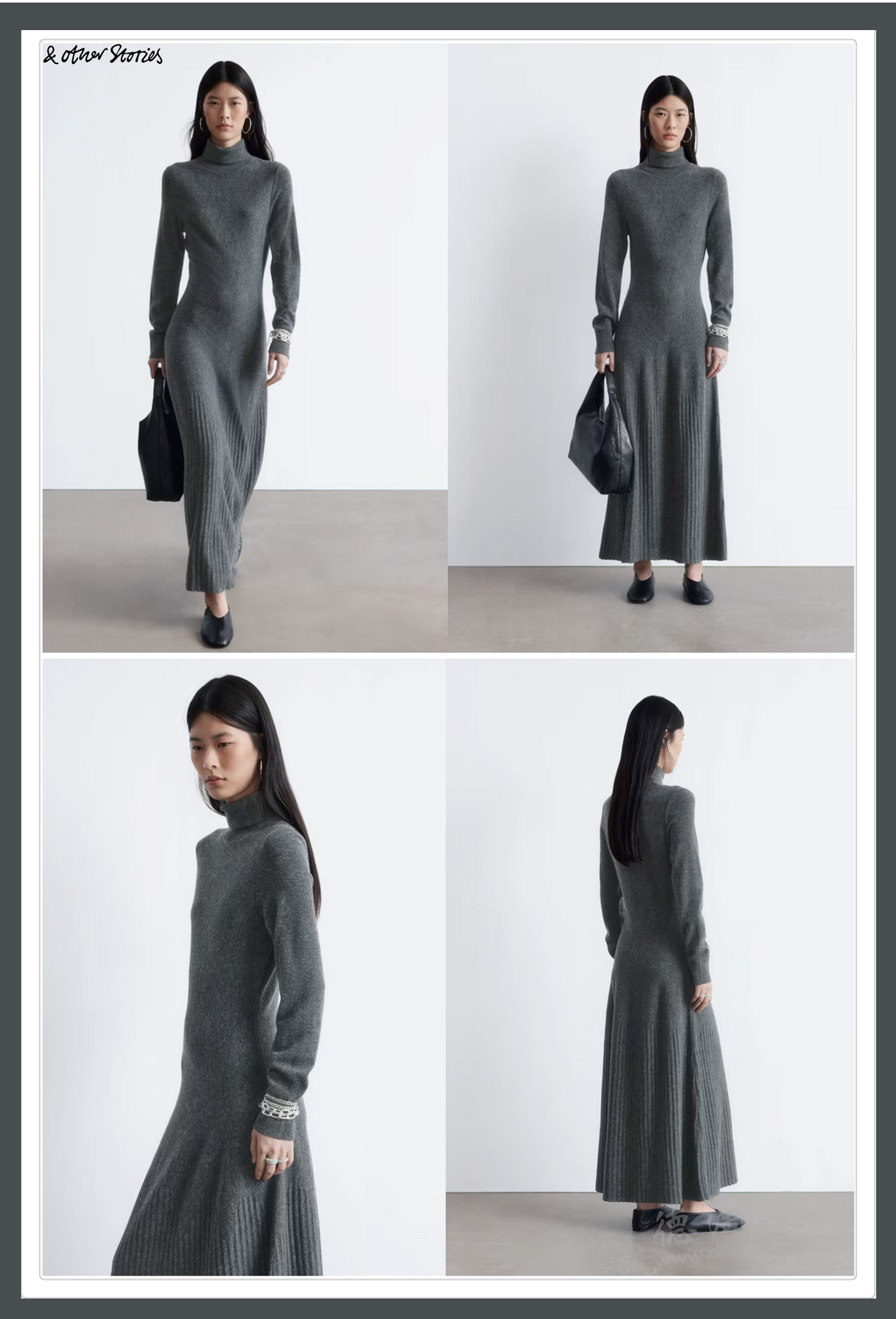 ★【& other stories ♠️半高领针织毛衣 特价仅99欧!】 冬天出门无脑打底的羊毛长裙,很亲肤贴身穿也没问题!灰色调更浓郁,黄皮更显白!甄选100%美利奴羊毛精心织就,触感细腻柔软,兼具出色的保暖性与透气性。可折叠高领设计勾勒出优雅颈部线条,简约而富有格调。整体为修身剪裁,自腰部自然过渡至A字裙摆,行走间流畅垂坠。