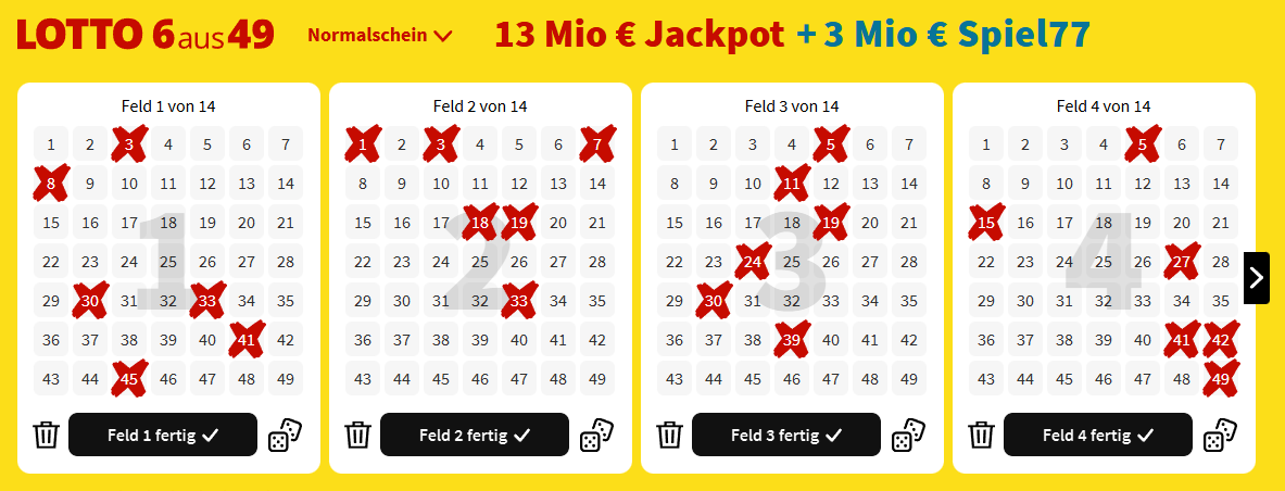 【2300万欧元 Jackpot就等你来拿!现在新用户玩 Lotto 6aus49 10次机会只要1欧!】平时玩Lotto或者不玩Lotto的小伙伴可以来看一看啦!1欧买不了吃亏买不了上当,纯属试试运气嘛!6aus49是从每一格选6个数字,就是一次机会。猜对三个数字就能领奖,如果七个数字全对就是头奖啦!只要有德国合法签证都可以领奖!
