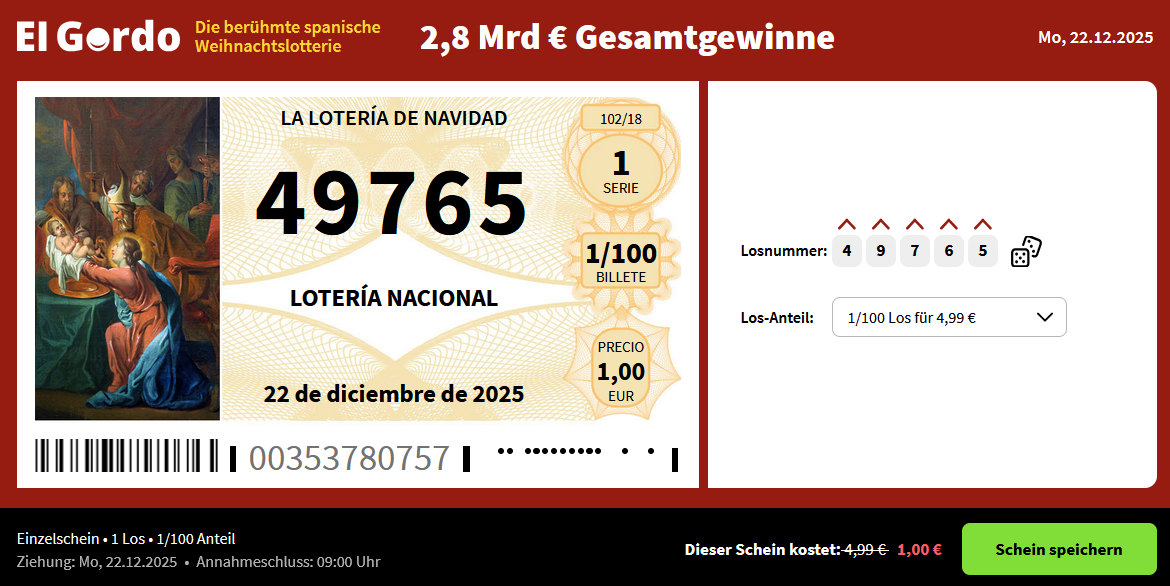 【El Gordo 西班牙圣诞彩票 总奖金高达28亿欧元! 黑五活动仅需1欧!试试运气~】传奇的西班牙圣诞彩票,是世界最大的博彩盛事之一,12月22日国家彩票管理局组织在马德里皇家剧院开奖,一大一小两个金光灿灿的笼子作为摇号的容器,随机摇出中奖号码,然后由小学生们依次用“歌唱”的形式报出。开奖过程由电视以及广播进行三小时以上现场直播,直到小摇号器中的球都摇完,圣诞彩票的抽奖仪式便正式结束。