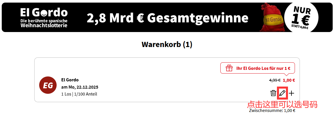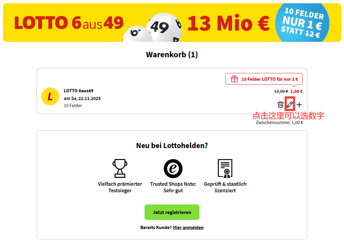 1:点击上面购买直达链接,大家会发现购物车里已经拥有了一注彩票啦!并且金额为1欧!