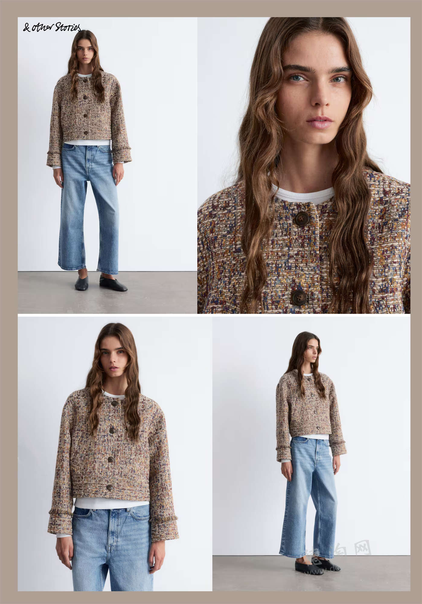★【& other stories 🤍短款粗花呢外套 特价仅119欧!】 松弛千金风!以羊毛与棉质混纺织成的精致粗花呢立体织面,呈现轻柔质感的小香风效果。短款利落的箱型廓形,勾勒干净肩线,轻松拉长整体比例。袖口以手工感毛边细节增添轻微的不规则美感,在经典中释放一点随性。正面与袖口均点缀精巧纽扣,搭配斜开插袋,使结构更利落,也兼具功能性。