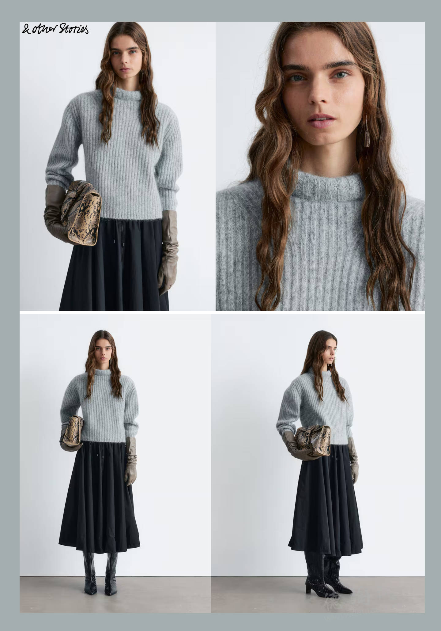 ★【& other stories 🧶中领针织毛衣 特价仅69欧!】 这款毛衣以舒适包裹感的茧型廓形呈现,柔软贴合身体曲线却不束缚,自然流畅的线条尽显轻松优雅。卷边圆领与圆润的袖口设计,增添法式随性风格,同时兼具温暖与时髦感。材质是39%RWS羊毛加30%RMS马海毛,轻盈蓬松,触感高级。