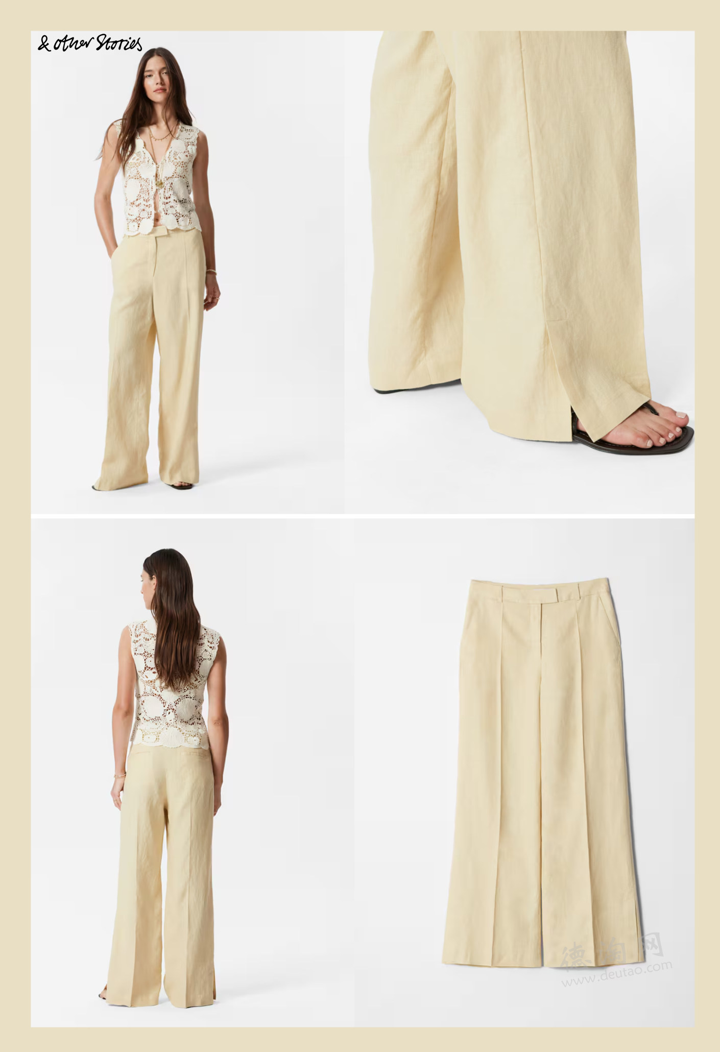 ★【& other stories ✨高级亚麻长裤 特价仅45欧!】 以纯净线条重新诠释清爽质感。这条亚麻长裤采用中腰剪裁与利落直筒版型,搭配精准立体的前压线设计,背面双口袋,在轻盈面料间勾勒出干练轮廓。若想呈现更随性的松弛感,可选择大一号穿着,轻松实现慵懒而不失格调的造型。