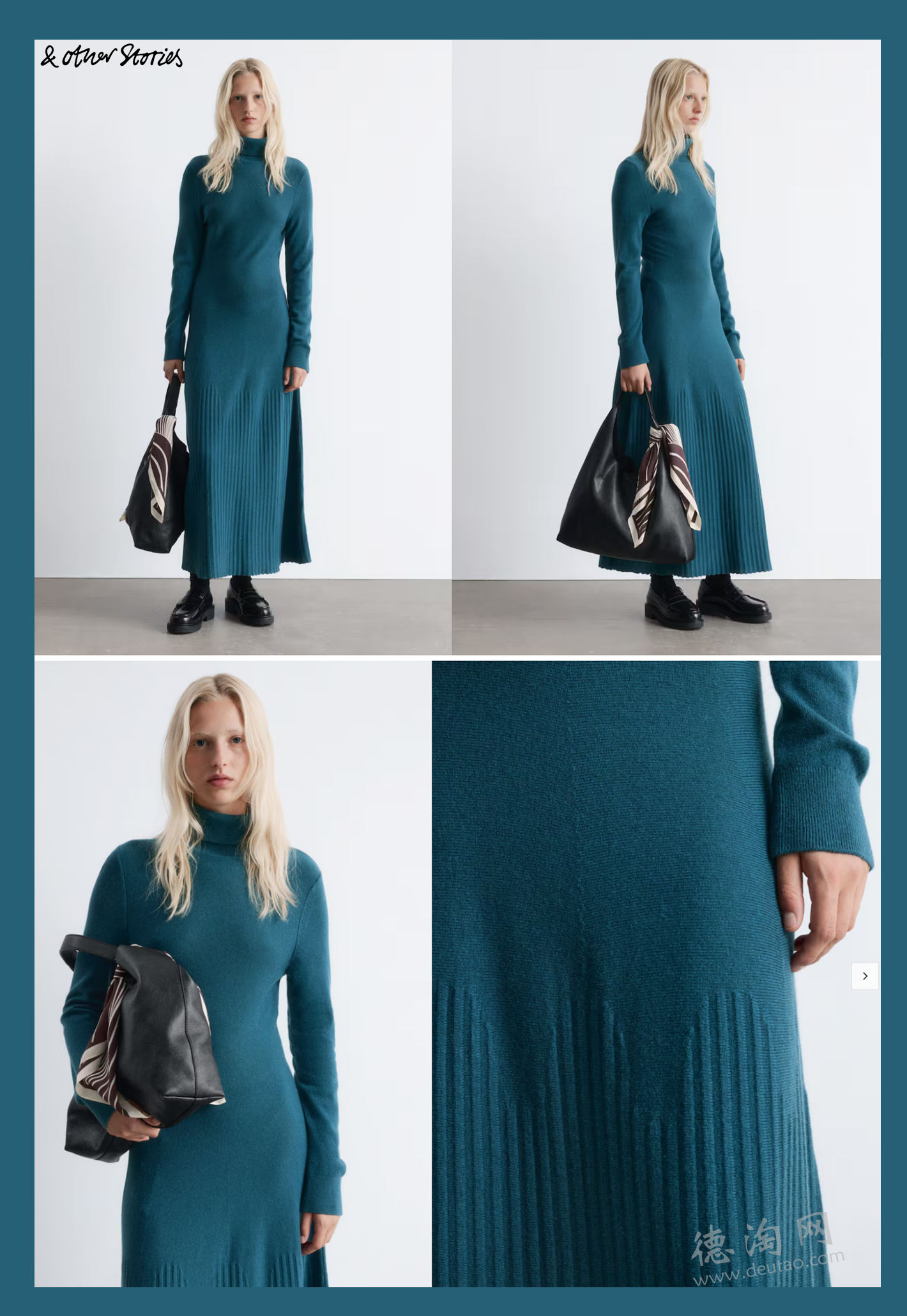 ★【& other stories 🩵羊毛高领长款连衣裙 特价仅89欧!】 整件连衣裙由100%美利奴羊毛编织而成,柔软却结构感鲜明。折叠高领设计自然延伸颈部线条,贴身上半身剪裁在腰部下方轻柔展开,向下延展成A字伞摆,不仅显高显瘦,步履之间还能呈现克制却流动的优雅。裙摆以罗纹细节收束,增添微妙层次感。