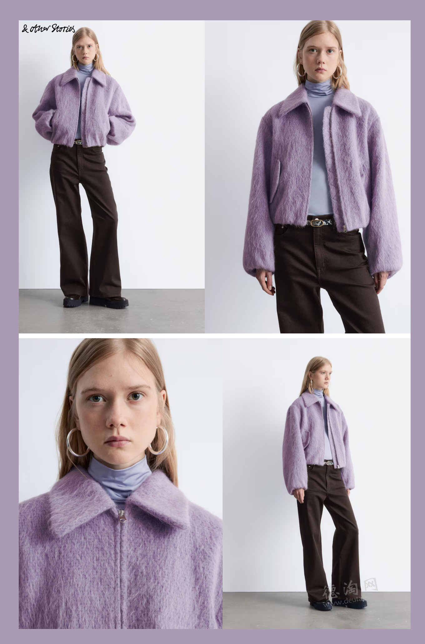 ★【& other stories 🔗短款羊毛飞行夹克 新品85折优惠仅194欧!】 以细腻羊毛混纺制成,外层覆盖柔软毛绒纹理,轻盈却富有触感,营造冬日丰盈层次。短款方形廓形呈现冷静利落的线条感,轻薄填充让温度与质感并存。翻折领口增添干练气场,平衡帅气与甜美感。