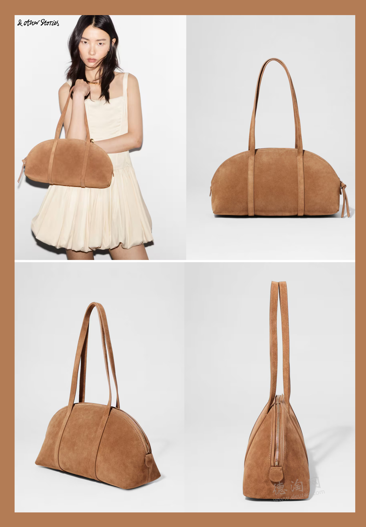 ★【& other stories 🎳麂皮保龄球包 新品85折优惠仅126欧!】 灵感源自复古保龄球包款。柔软麂皮呈现细腻雾面光泽,触感与视觉皆低调高级。纤细的肩带一体延伸至包身底部,使线条更加流畅利落,整体比例精致又耐看。顶部拉链设计搭配皮革拉头,细节处更显精致质感。