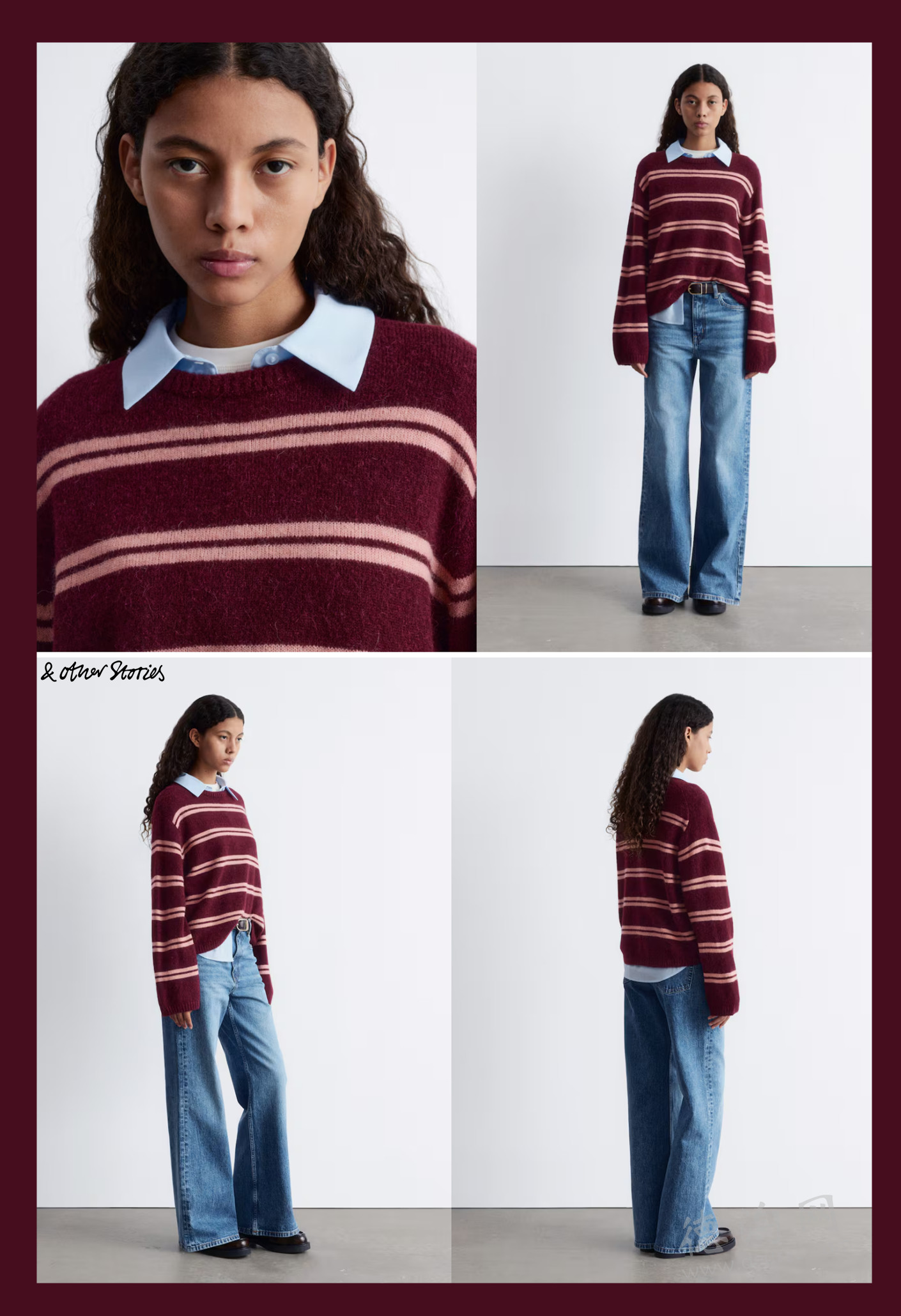 ★【& other stories ❄️条纹毛衣 特价仅55欧!】 质地温暖、视觉轻柔的宽条纹毛衣。以柔软的羊驼毛和羊毛混纺 织就,触感轻盈蓬松,保暖度却毫不妥协。毛绒质地带来空气般的包裹感,宽松廓形搭配落肩设计,线条自然松弛。长而微阔的袖型延展比例,版型更随和显瘦。