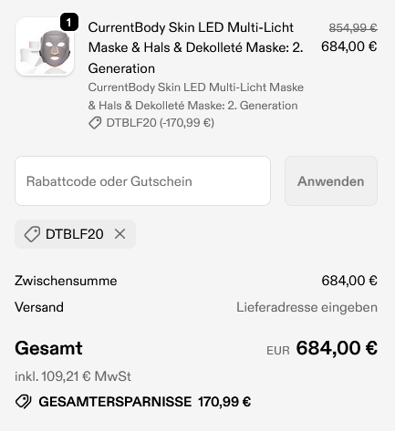 ★ 输入优惠码方法:选择商品,放入购物车,点击黑色按钮(DEBIT/KREDIT或者Zur Kasse),跳转到支付页面,就会出现可以输入优惠码的页面!