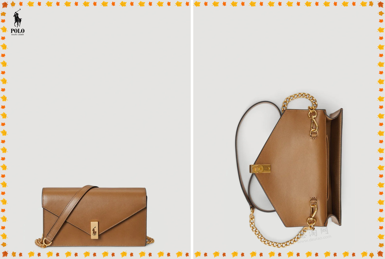 • 【Polo Ralph Lauren 棕色信封包 折后仅175欧,原价345欧!】 温润的浅棕色皮革诠释品牌一贯的经典美学。精选顺滑皮革,触感细腻,色调克制而高级;极简纯色设计,让线条与材质本身成为主角。磁扣开合利落从容,举手投足间尽显洗练气质。内部结构清晰:卡槽、插袋与主隔层一应俱全,满足日常出行所需,却不显繁复。