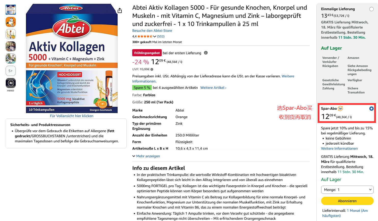 【保养骨骼要趁年轻!Abtei Active Collagen 5000骨骼保养饮10支 亚马逊自营款春促特价仅12欧!!!】人体的骨骼、软骨和关节是健康和正常活动的基础。随着年龄增长,缺乏运动和不正确受力方式会让骨骼和关节变得越来越脆弱。这款Abtei的骨骼保养饮以高品质生物活性胶原蛋白肽为基础,特别添加维生素 C、维生素 B6、镁、锌和硅元素。胶原蛋白是软骨和骨骼中最重要的纤维蛋白,镁能支持正常的肌肉功能,含锌以维持正常骨骼,维生素 B6有助于人体新陈代谢。含有创新成分FORTIGEL,营养成分能够很好地被人体吸收。清爽的橙子味,当饮料喝口感也很好!