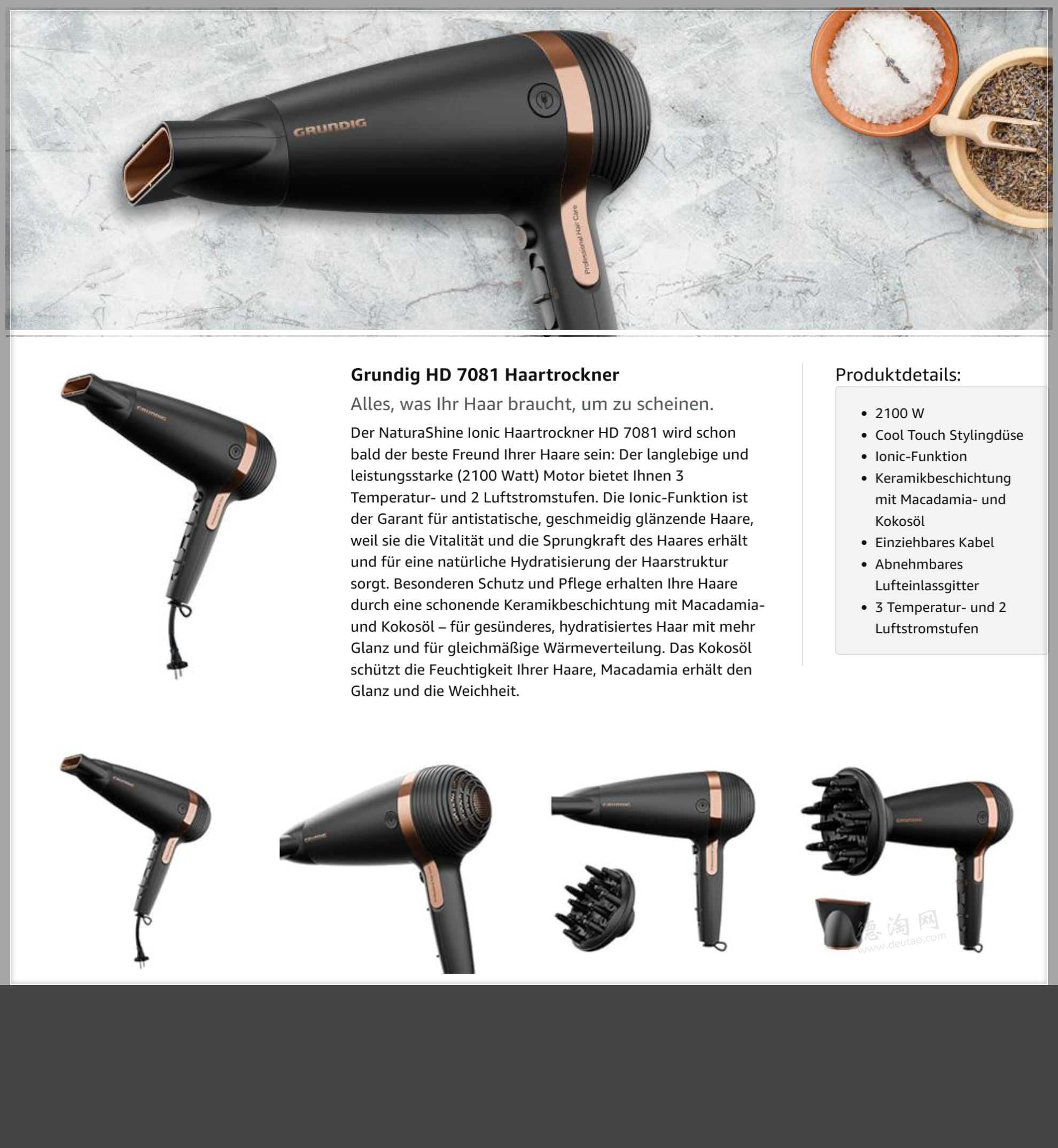 【沙龙级别护理!GRUNDIG Naturashine HD 7081 吹风机 今天特价仅23欧!】2100W强劲风力,从湿发到顺滑,仅需片刻。忙碌清晨,也能从容出门。Ionic负离子科技有效减少静电,让发丝更服帖顺滑,呈现自然光泽感。陶瓷涂层结合澳洲坚果油与椰子油成分,在热风中温和释放护理力,减少热损伤,同时提升柔软度与光泽度。3档温度+2档风速组合,适配不同发质与造型需求。独特防热设计,风嘴在使用过程中保持低温,避免误触烫手,让造型更安心。