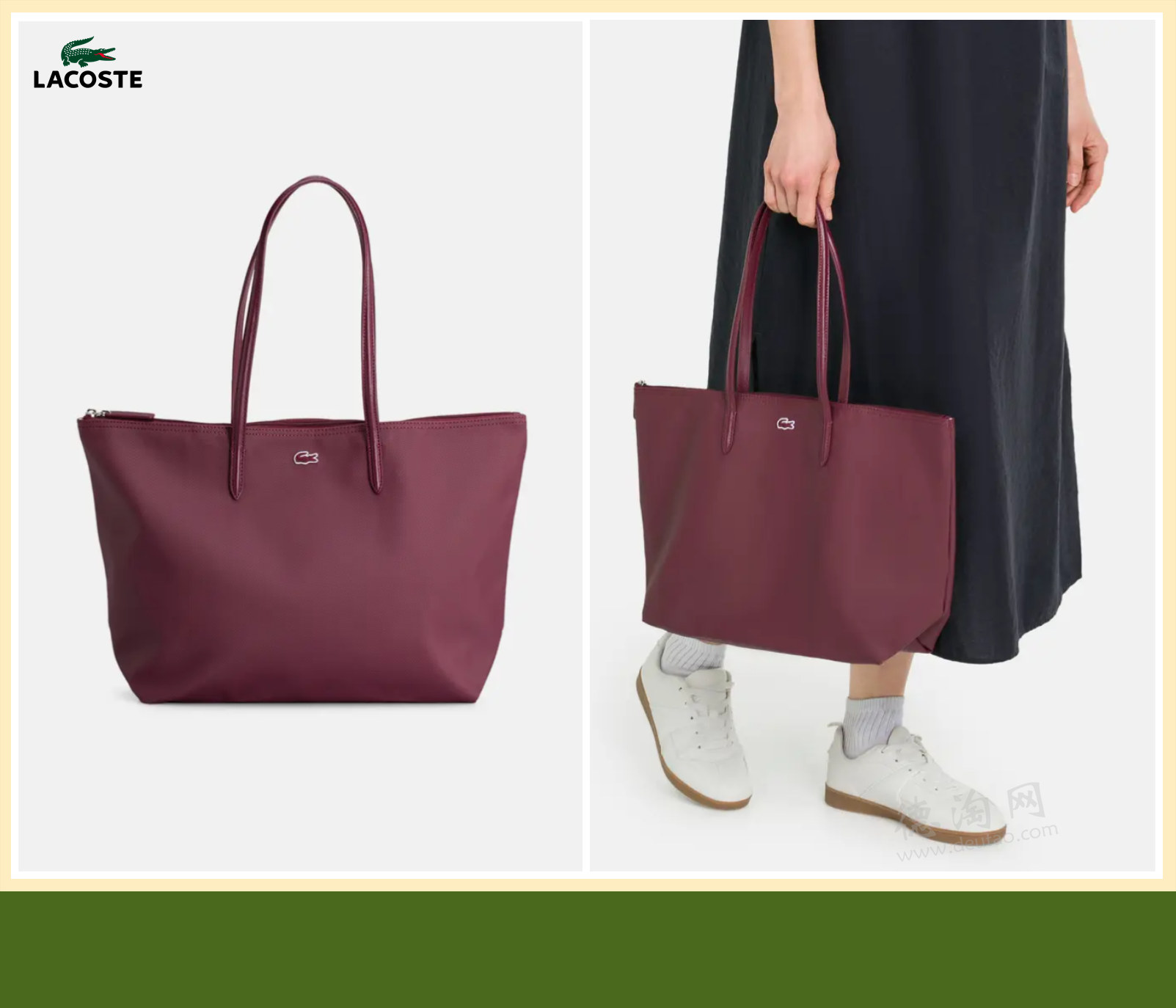 ❤【Lacoste Shopper托特包 折上折仅68欧!】 幻视珑骧,设计更简约不容易撞包!酒红色调自带情绪张力。既稳重,又能为整体造型增加存在感。表面带有细腻纹理的材质,让包型更挺括,同时兼顾实用性。不娇气,更适合高频通勤使用。宽敞内部空间,轻松容纳日常随身物品。双提手结构,肩背或手提都自然顺手,适配不同出行场景。
