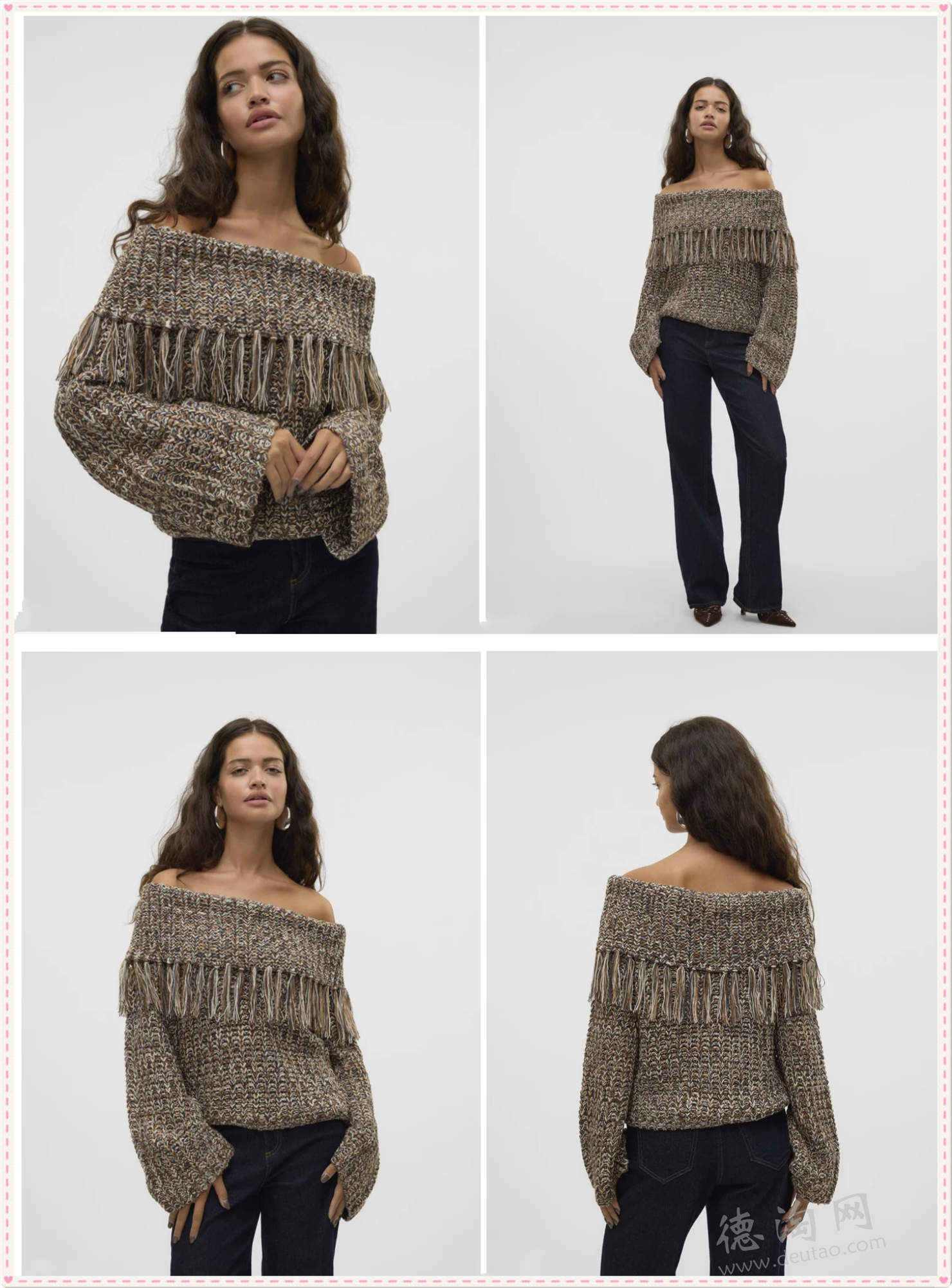 • 【Vero Moda 露肩针织衫 折后仅24欧,原价69欧!】 混色针织介于棕与橙之间的暖调色系,波西米亚风自带治愈氛围。经典一字肩设计,轻轻露出肩颈线条,让整体造型多了一丝呼吸感与女性魅力。衣摆流苏设计,让整体更有层次与动态感。细腻针织面料贴肤舒适,既适合单穿,也能作为叠搭单品。