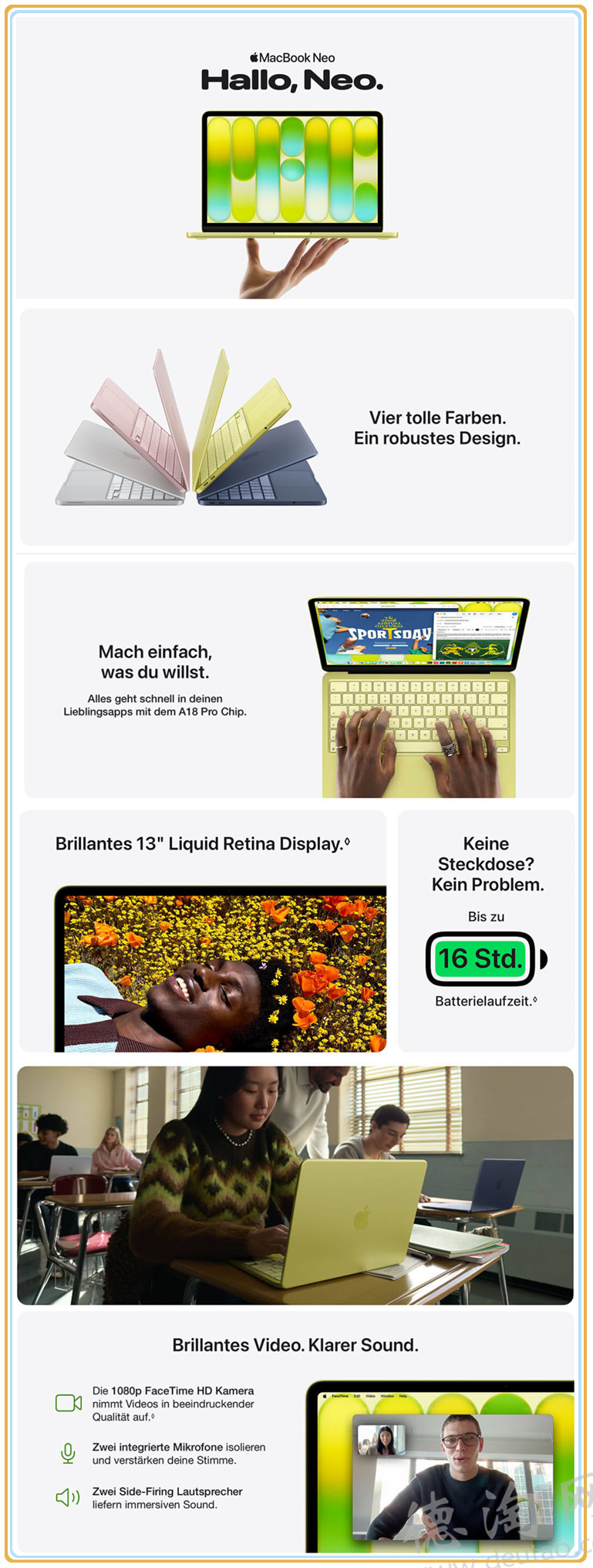 【低成本上车苹果AI和OS系统!Apple 13″ MacBook Neo 亚马逊自营款特价仅599欧!】一查销量吓一跳!已经成为苹果首周销量最佳笔记本,卖爆到官方紧急补货。13英寸轻巧机身,搭配同色系键盘,坚固铝金属机身延续Apple 一贯的简洁质感,高级的视觉存在感颜值没话说。A18 Pro芯片为日常学习、办公、创作与AI使用提供流畅动力。整理课堂笔记、分析表格、修图、视频通话,或使用Apple AI辅助写作与总结内容,都能在轻薄机身中完成。2408 × 1506 2K分辨率、最高500尼特亮度,并支持十亿色显示。文字清晰锐利,画面色彩细腻鲜活,浏览网页、看课件、处理图片,还是追剧,都能带来更明亮通透的视觉体验。