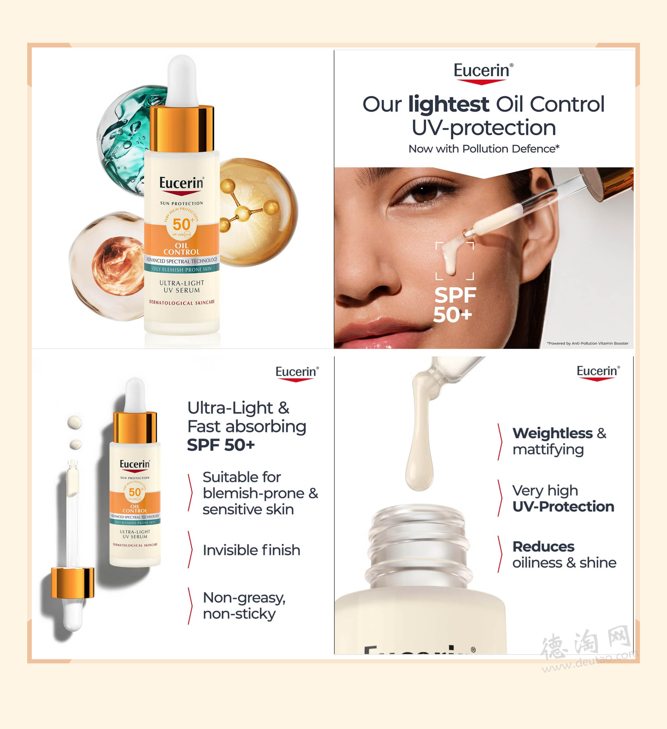 ❤【油皮友好的轻透防晒精华!Eucerin Oil Control Ultra-Light Daily Serum SPF 50+防晒精华30ml 特价仅25欧!】
