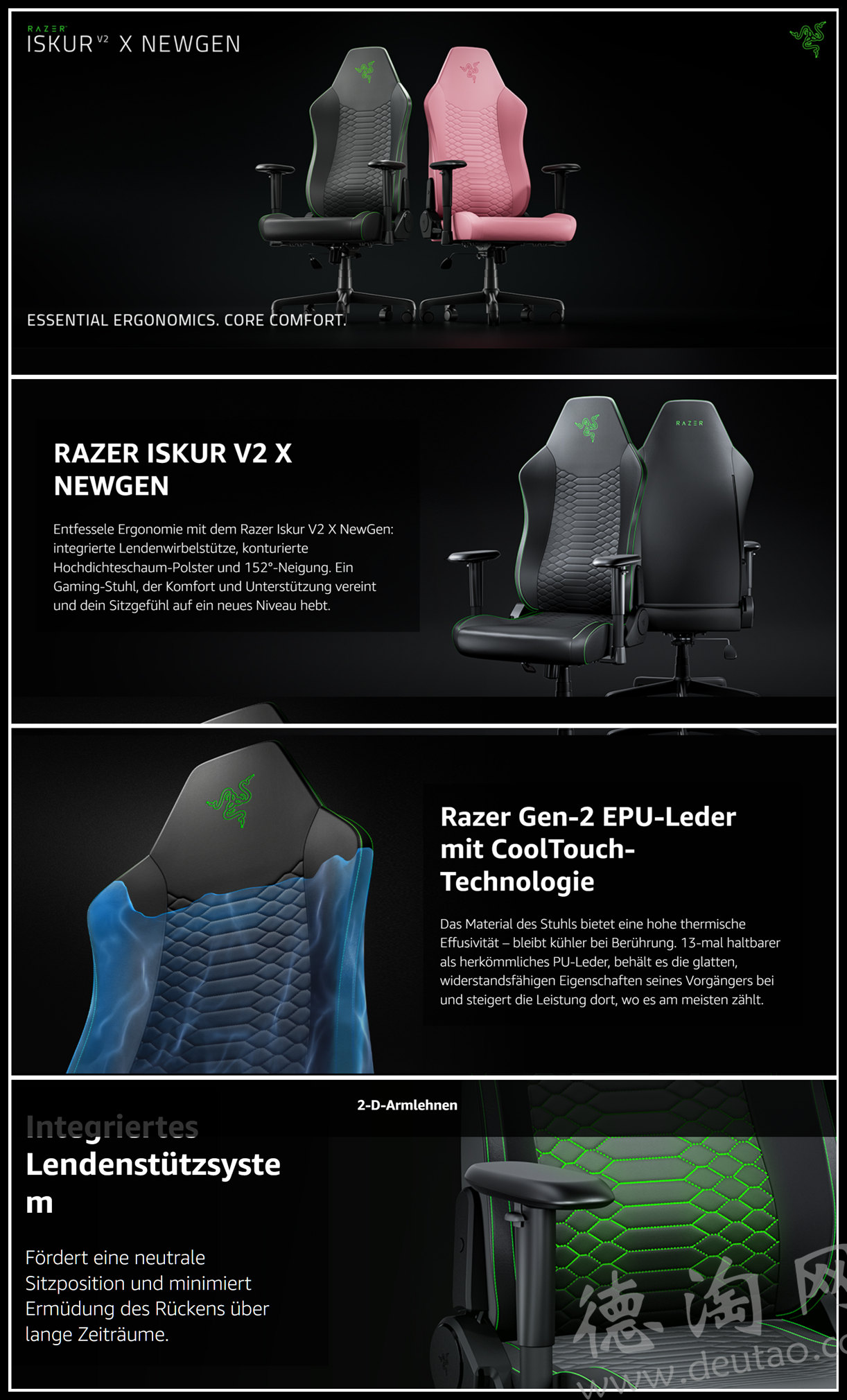 【夏天宅家舒服又不闷!Razer Iskur V2 X NewGen 电竞椅 亚马逊自营款56折优惠!】采用第二代EPU皮革,并加入 CoolTouch冷感技术,触感更清爽,同时具备耐磨属性,适合日常高频使用。内置腰部支撑是它的核心亮点。无论是短时间休闲游戏,还是长时间刷副本、剪视频、办公学习,都能帮助身体保持更自然的坐姿,减少久坐后背部疲劳感。双密度冷固化泡棉坐垫则让承托更均匀,久坐时不容易出现局部压迫感。加宽肩部弧线与宽大坐面,给身体更多活动余地。喜欢靠着坐、盘腿坐、交叉腿坐,或是在不同坐姿之间切换,都能拥有更自由的空间。4D扶手可调节高度与角度,配合最高 152° 后仰角度,从专注操作到放松休息,都能找到适合自己的姿势。