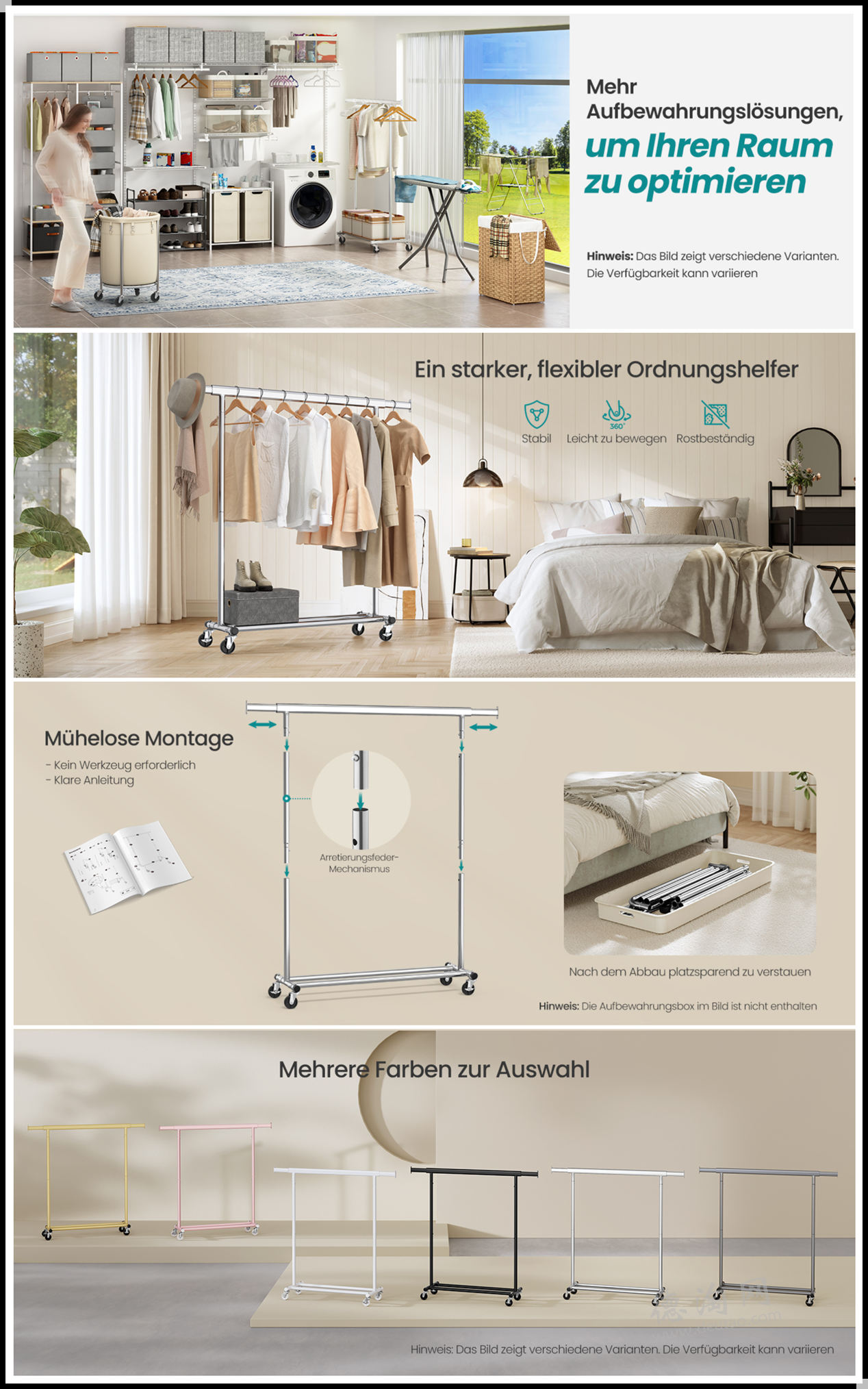 ★ 【SONGMICS 重型移动衣架 现特价仅25欧!】 镀铬金属外观干净利落,适合卧室、衣帽间、洗衣房,也可以作为换季衣物、外套、拍摄服装或临时陈列的收纳架使用。承重力强。1 mm厚钢管搭配高强度PP工业脚轮,最高可承重100 kg,即使挂厚重大衣、夹克、西装或多件衣物,也能保持稳定。衣杆支持双侧延展,两端各可加长20cm,整体挂衣空间从92cm扩展到132cm,适合衣服多、外套多,或需要临时扩容的人。