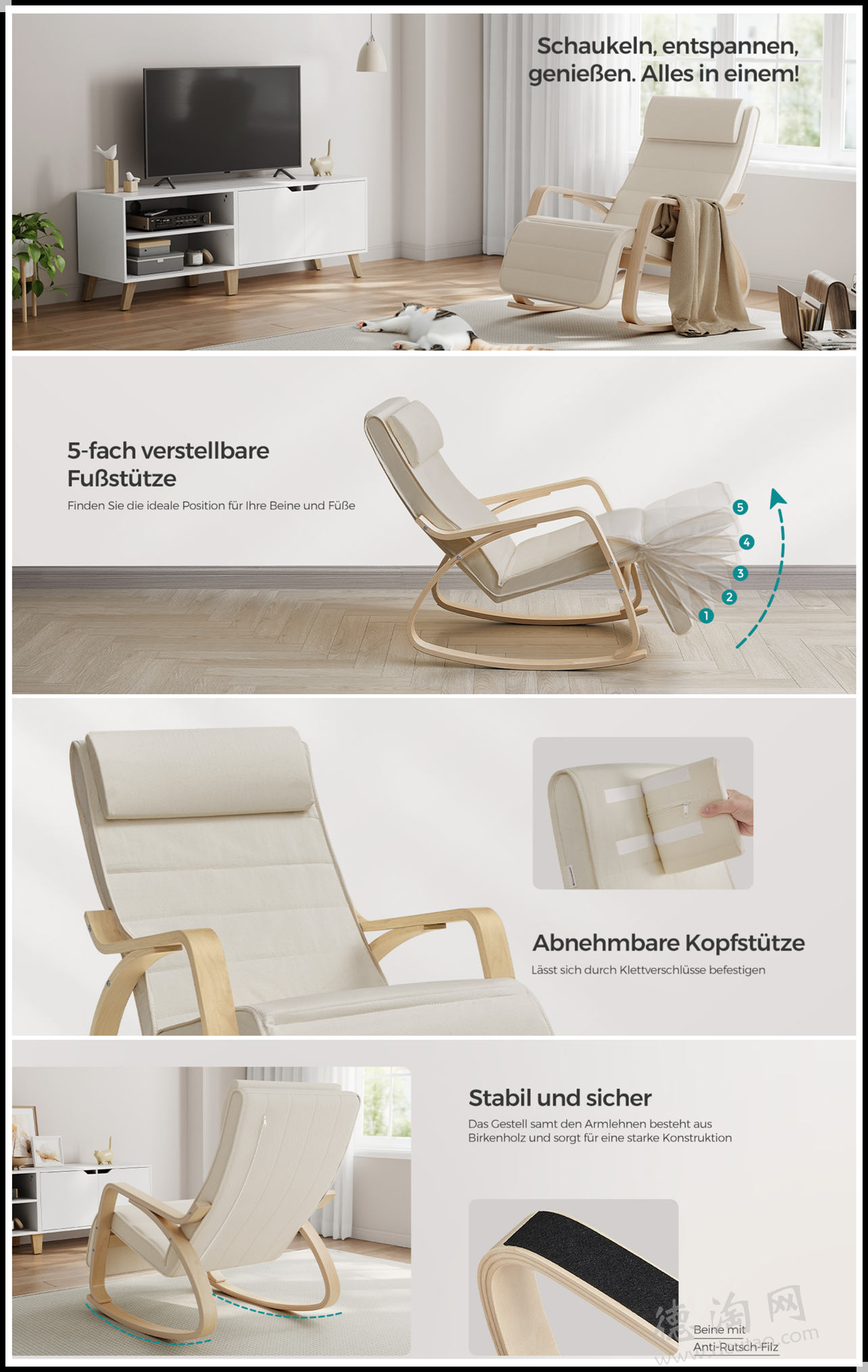 ★ 【SONGMICS 米色木质摇椅 现特价仅58欧!】 很适合居家慢生活的柔和气质。浅色布艺搭配桦木扶手,视觉上干净、温暖、不压空间,放在卧室、客厅、阳台阅读角,都能营造出安静舒展的氛围。它采用高品质桦木与内部金属框架组合,最高可承重150 kg,坐感稳定安心。轻轻前后摇晃时,适合午后小憩、睡前阅读、听音乐,或只是让身体从一天的疲惫里慢慢松下来。