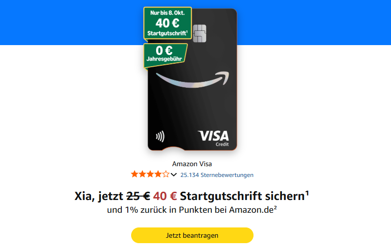 【Amazon Visa 亚马逊信用卡 Primeday活动送40欧奖励+无年费!消费还能积分返现~】亚马逊的Visa信用卡又有了!这次没有任何条件免年费~注意需要满18周岁和有德国地址才能申请,拥有这张卡你可以享受到如下优惠: