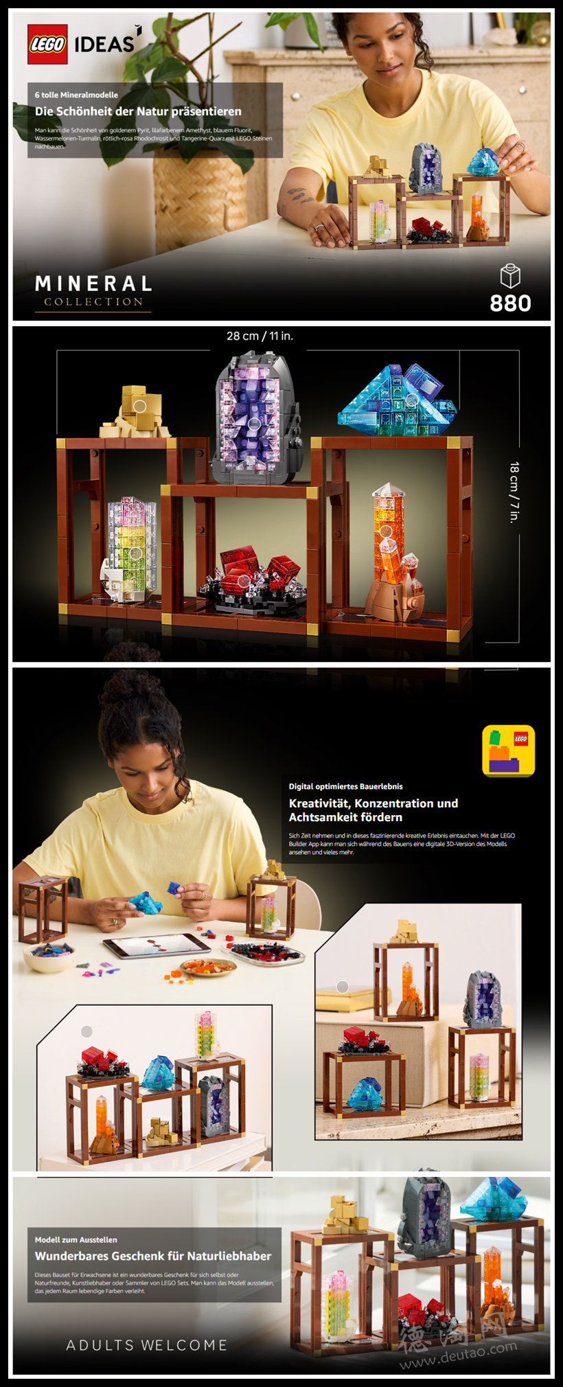 【用积木堆砌出闪耀夺目的璀璨矿石!🪨LEGO Ideas 矿物收藏系列 亚马逊自营款特价仅41欧!】6款彩色矿石复刻,黄铁矿、紫水晶、菱锰矿、萤石、西瓜碧玺和橘石英,象征爱、智慧与正能量,使用多种透明零件打造,呈现矿石的自然美感!这一组包含了六种矿石和三个木质层架。包含各种漂亮的透明零件,除了紫水晶必须正面展示之外,其他矿石不论从哪个角度看都很漂亮。三个模块化 LEGO 搁架,可组合或分开摆放。支持随时更换矿物布局,打造变化多样的家居展示。不仅是拼砌玩具,更是家居艺术品。