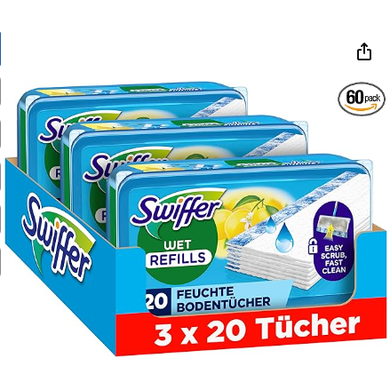 【家里用Swiffer拖把的亲可以补货 Swiffer湿抹布 3×20片!圣诞特价仅13.99欧!!!】轻轻一拖,污渍去无踪!湿巾由 36% 的天然纤维制成,具有强效溶解污垢的清洁配方,适用于木材、陶瓷和乙烯基地板。搭配转动拖把使用,任何死角都能搞定!拖完一遍直接扔掉,非常方便!天天拖地都不会觉得麻烦啦!