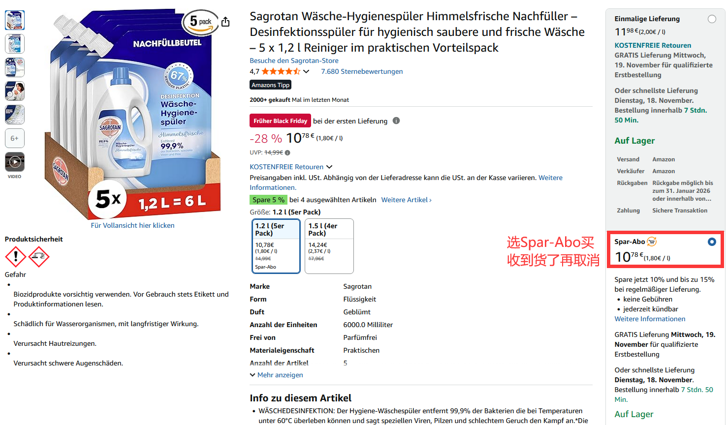【Sagrotan 衣物消毒液 补充装1.2升*5袋装 黑五特价仅10欧!!!还有敏感肌肤专用!】用洗衣机洗衣服一定不可少消毒液!尤其是贴身衣物,毛巾等等。Sagrotan的消毒液有口皆碑,是德国的畅销品牌。能够清除99.9%的细菌,即使在低温下也能抵抗特殊病毒,真菌和灰尘!