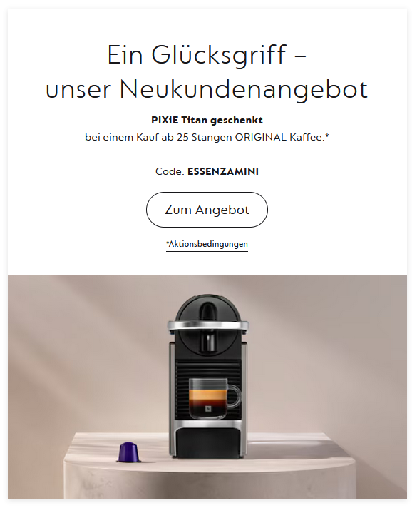 【Nesspresso官网活动 买25条咖啡胶囊,免费送价值159欧Nesspresso咖啡机!!! 】Nespresso官网给新用户的好活动~购买25条咖啡胶囊,就能免费活动一台价值159欧Nesspresso咖啡机!可以选择任意你喜欢的口味~活动有效期至12月31日!