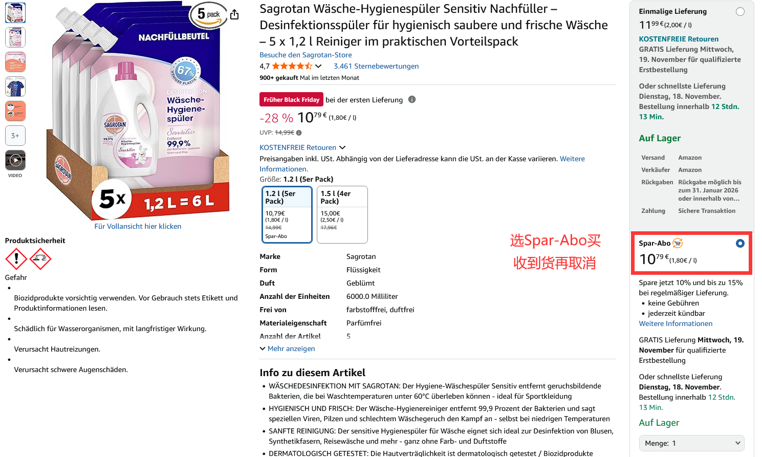 【Sagrotan衣物消毒剂敏感肌肤版5×1.2L 黑五特价仅10欧!!!】