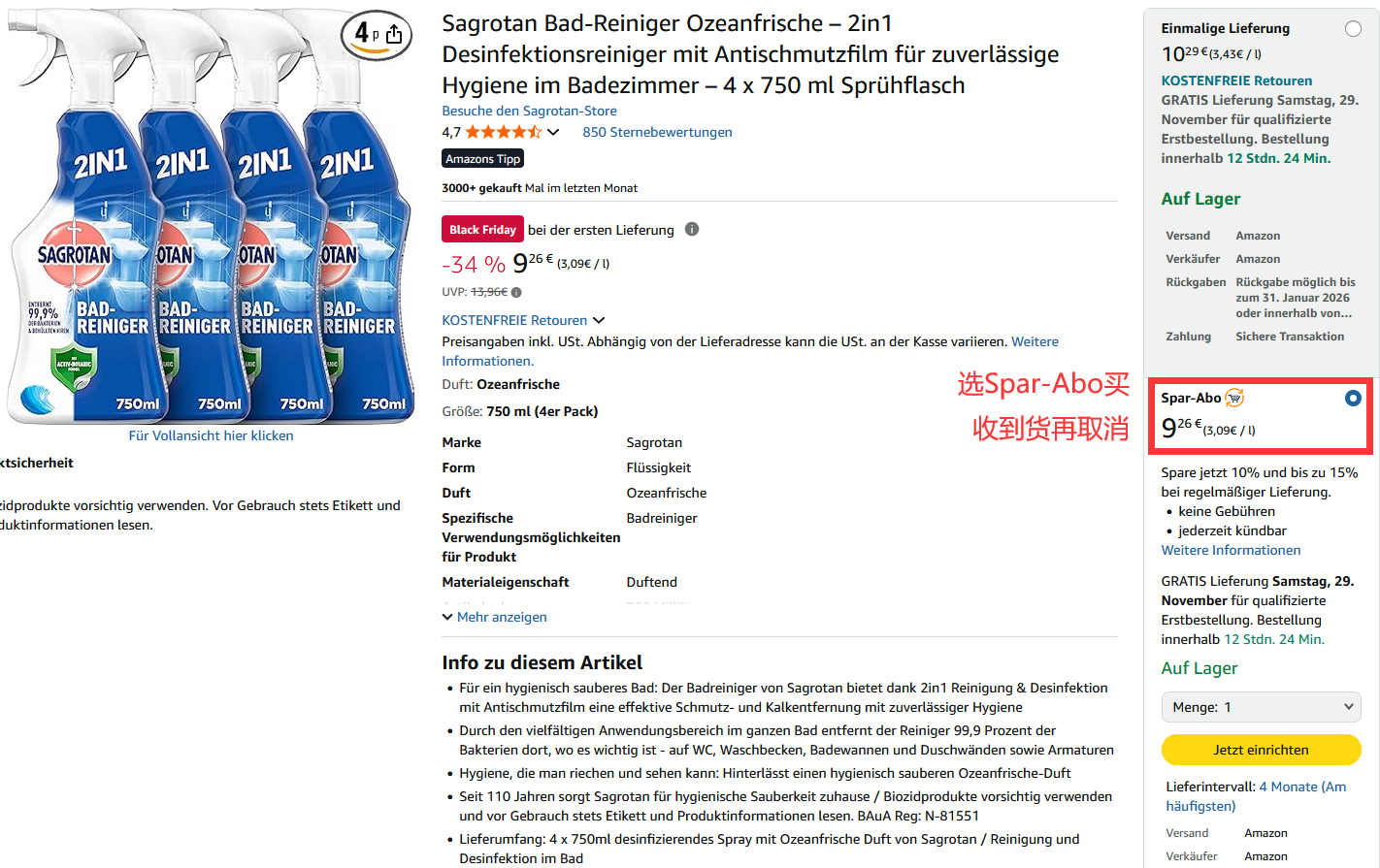 【Sagrotan 浴室清洁剂 4×750ml 黑五特价仅9欧!!!】