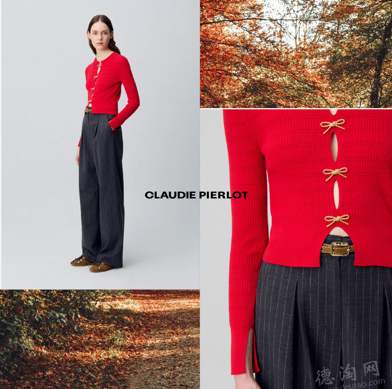 【Claudie Pierlot 蝴蝶结扣红色针织开衫 折后仅112欧!原价225欧!】 很适合春节穿,红色配金色纽扣太喜气了!针织贴合身体线条,圆领设计干净克制,勾勒出利落上身比例。沿躯干分布的镂空与织纹,整体轻盈有层次!最点睛的,是胸前的金色绳结纽扣,像是一枚低调的珠宝。罗纹收边勾勒领口、袖口与腰线,强调身体曲线却不过分贴身。无论搭配西装裤、半裙,还是作为内搭叠穿,都能自然融入搭配。