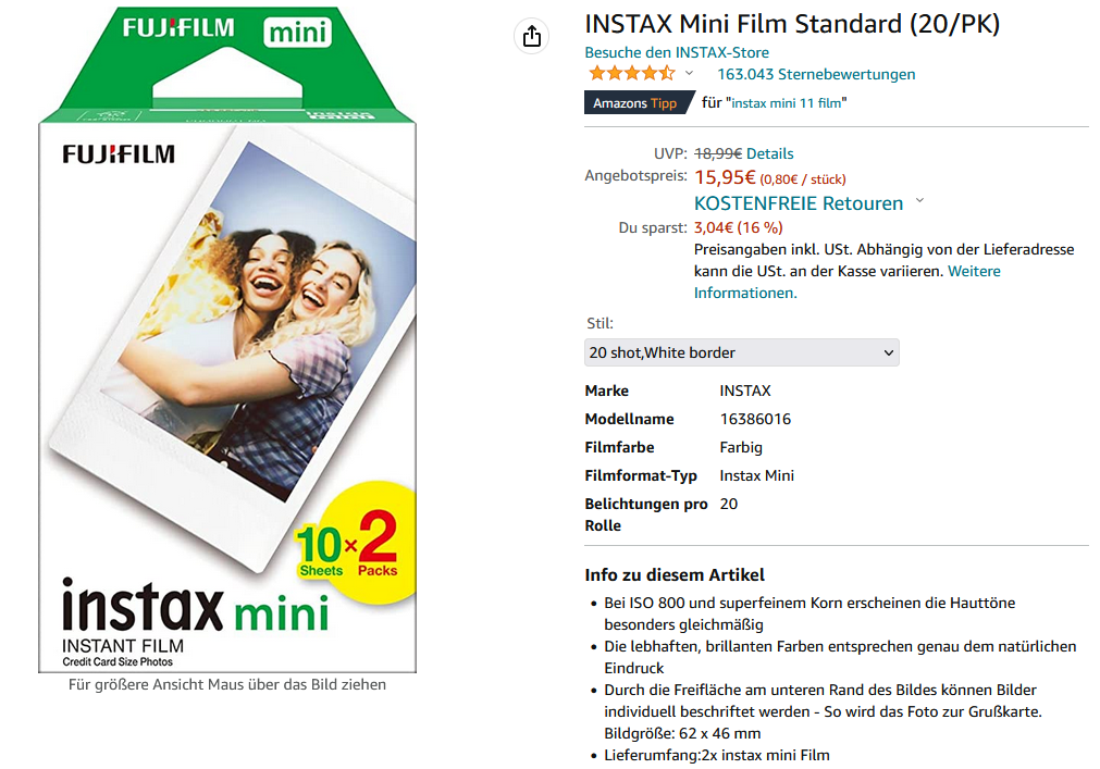 夏天聚会出游拍照神器!INSTAX Mini 12拍立得相机 五色可选,特价仅77欧!20张相纸也特价仅15欧收!!!