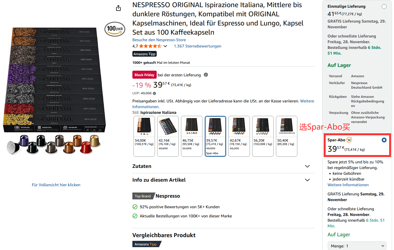 【NESPRESSO 咖啡胶囊套装100粒 黑五特价仅39欧!多种口味宛如进了咖啡厅,折算下来每杯仅0.39欧!】身为意式咖啡机领导品牌的Nespresso,拥有意式浓缩咖啡制作技术,让您在家或工作时皆能尽情享受口感香醇的浓缩咖啡。多款类型的咖啡胶囊套装,从不同浓度的牛奶咖啡到可可咖啡,云集来自世界各地的特产咖啡豆,一定能成为你发现香醇咖啡的品味之旅!