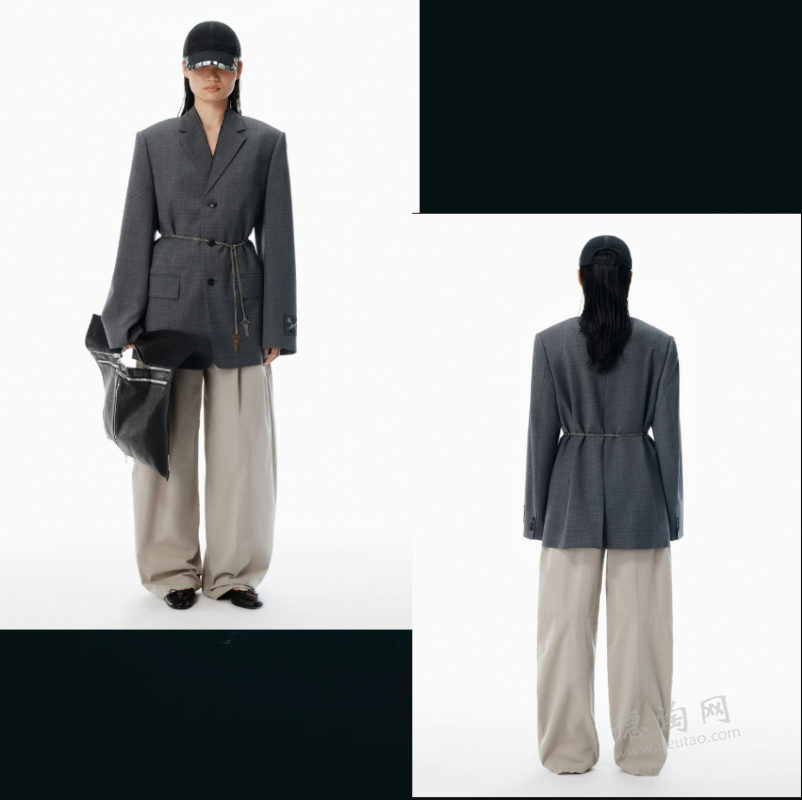 ❤【Alexander Wang/亚历山大·王 腰链Oversize羊毛西装 原价1100欧,折后仅665欧!】 细密的灰色杂纹呈现出高级轻雾般的质感,让整体廓形在低饱和度中显得更加干净、冷感且耐看。西装外套采用三粒扣门襟与平驳领设计,延续经典西装语言。链条的冷金属光感与羊毛材质的温润形成反差,强化了品牌标志性的锋利个性。