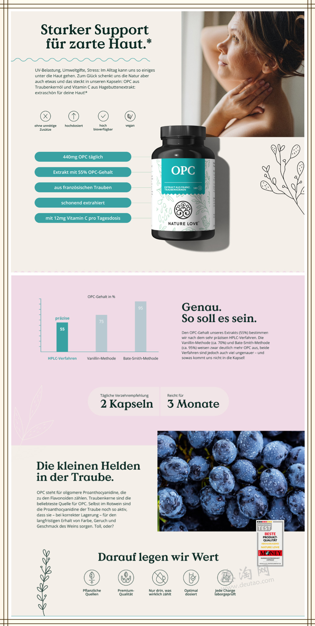 【抗衰抗氧化,补充胶原蛋白🍇Nature Love 天然有机OPC葡萄籽胶囊180粒 Primeday特价仅15欧!!!】OPC 是含有丰富黄碱素的当今最强力而有效的抗氧化剂,经过研究指出唯有含葡萄籽,松树皮和红酒的黄碱素吸收率最好!在欧洲葡萄籽被称为”口服的皮肤保养品”,是目前自然界最有效的抗氧化物质,它不但能防止皮肤皱纹的提早生成,更能补充营养及消除体内有害的游离子。Nature Love 天然有机OPC葡萄籽胶囊自美丽的法国,那里的葡萄在阳光明媚的葡萄园中壮成长,并且收获良多。一瓶3个月份量,每2粒OPC葡萄籽胶囊含有440毫克OPC营养素,另含有玫瑰果提取物和天然维他命C成分。能够有效消除疲劳,维持神经系统及免疫系统健康,并促进胶原蛋白形成!