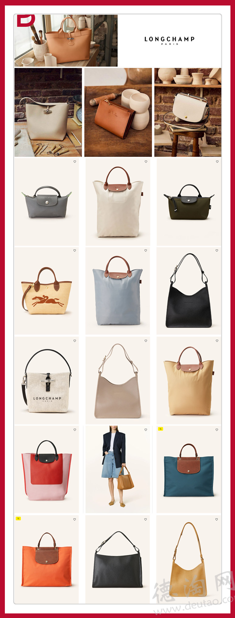 【法式优雅与现代时尚!Longchamp/珑骧🥐 全场低至5折+注册会员再减15欧!某书上超火配挂件的mini饺子包仅49欧!】隽永的法式美学和自成一派的时髦气质,珑骧早已成为无数超模、博主、气质女星出街造型中的标配单品。它不是那种招摇的logo包,却能悄悄提升你整个穿搭的质感。那份松弛又高级的法式调性,能让人一用再用、越用越爱。场内除了饺子包,还有更多法式休闲风格的手提袋、斜背包、手拿包等产品,满足不同人群和场合的需求。