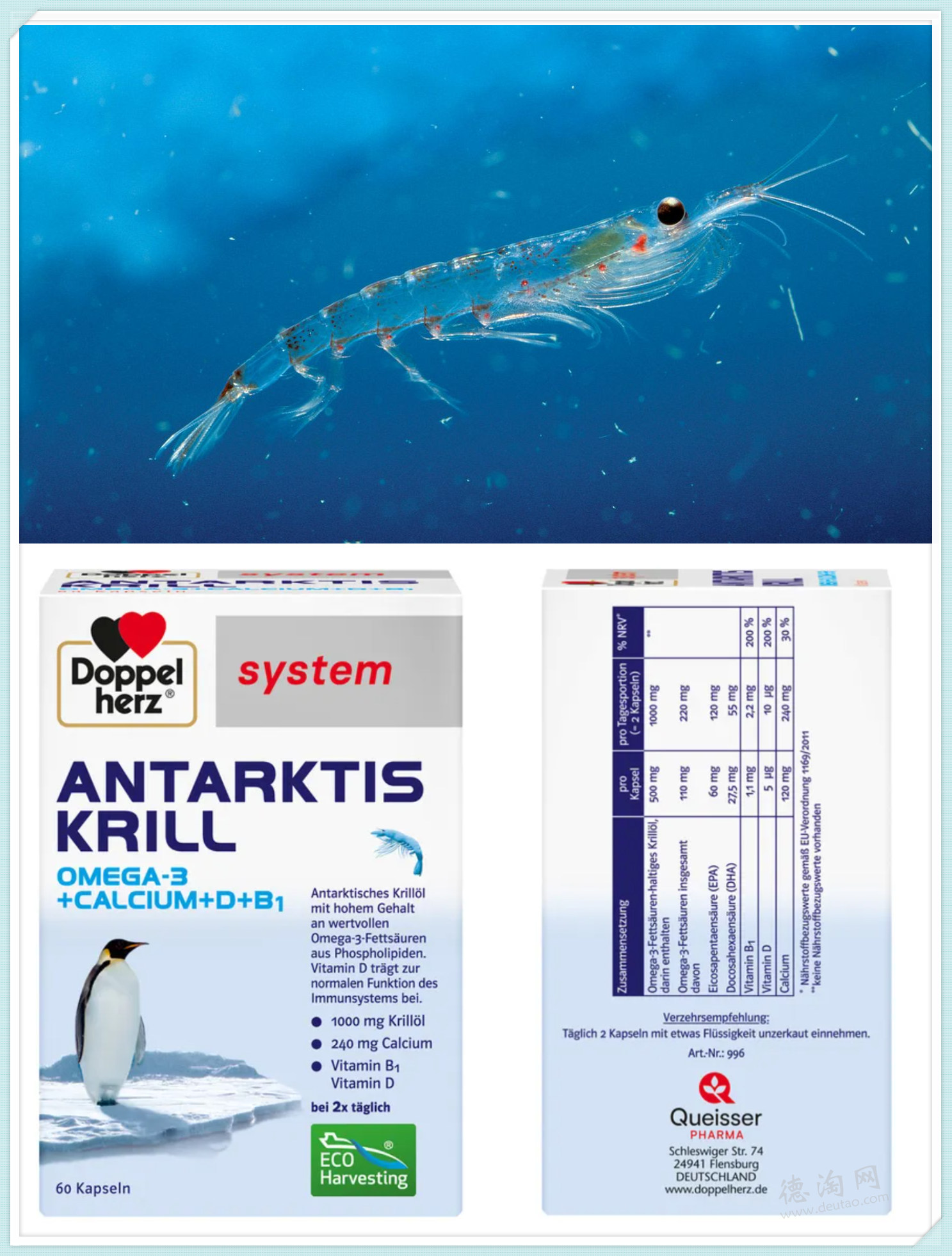 【心脏骨骼免疫力的小秘密!Doppelherz 双心南极磷虾油胶囊 60粒装特价25欧!!!】 来自南极纯净海域磷虾,磷脂结合形式高含量Omega-3比普通鱼油更好吸收!科学营养组合,支持心脏、骨骼与免疫健康。每粒含500mg南极磷虾油,富含EPA与DHA,有助于维持正常心脏功能。Omega-3能促进身体制造抗炎物质,有助于改善关节炎、皮肤和皮肤发炎等症状,对于生病期的身体恢复也有很好的效果!同时含维生素B1、维生素D与钙,支持心脏、骨骼、肌肉与免疫系统健康。