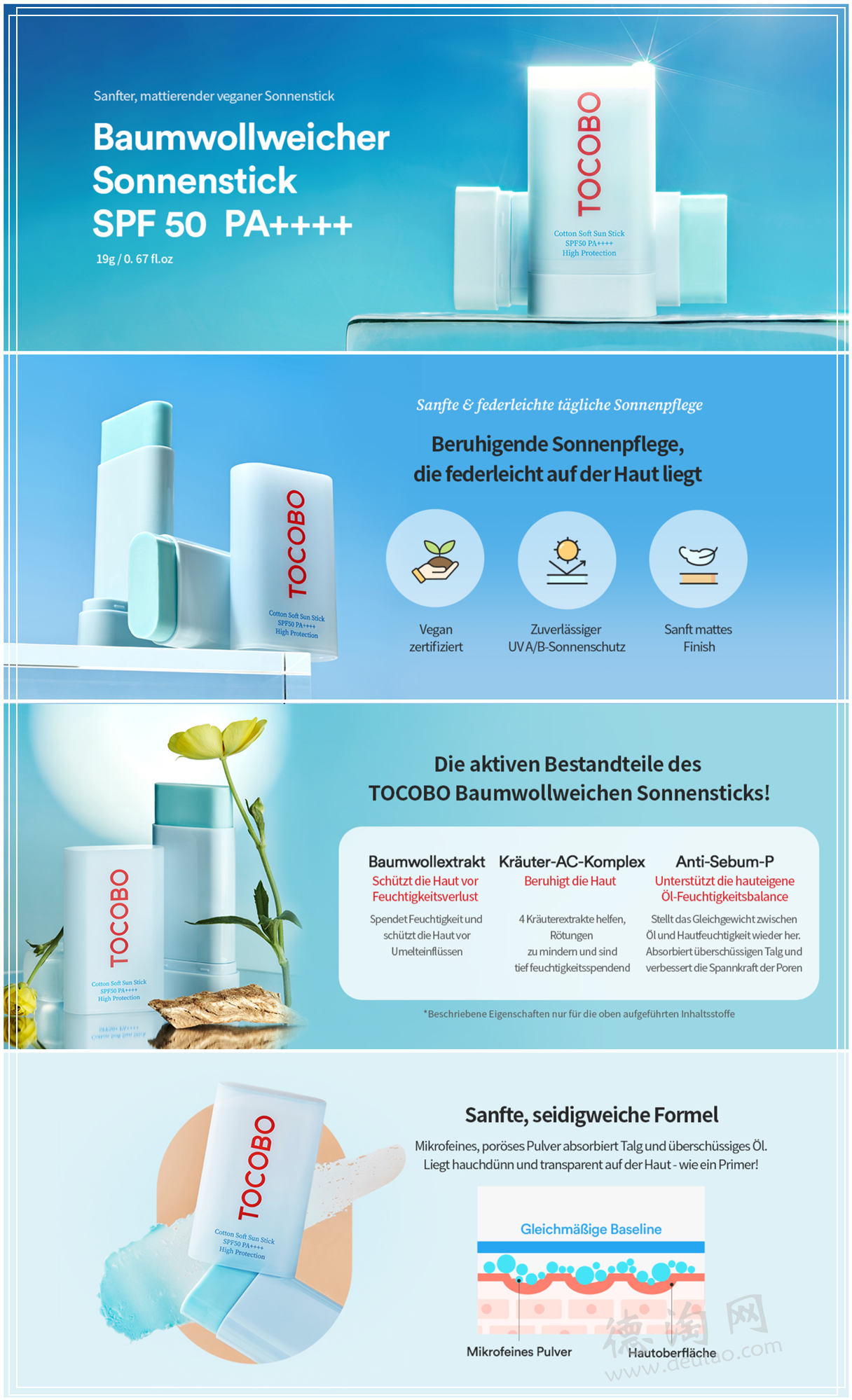 【暴晒拿出来随时补涂!Tocobo 棉柔防晒棒SPF50+ PA++++ 特价仅14欧!】