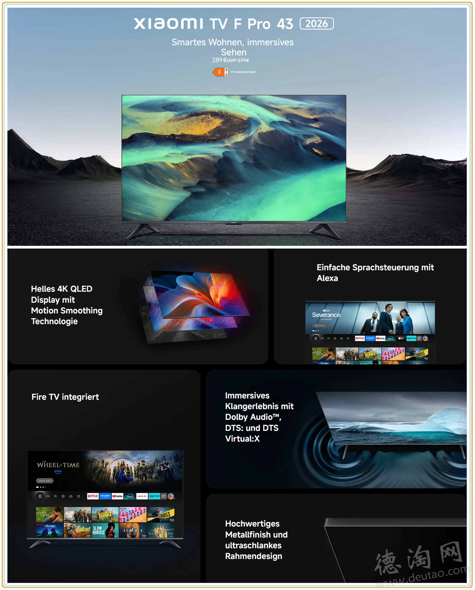 ★ 【Xiaomi小米 TV F Pro 43寸电视 圣诞大促仅289欧!】 同价位几乎没有对手,客厅娱乐之王!全新一代智能电视,给你影院级视觉震撼!4K QLED屏搭配94% DCI-P3广色域,10.7 亿色呈现逼真画质。支持MEMC运动补偿与 HDR10+,动态画面流畅清晰。双10W扬声器加持杜比音效,沉浸感拉满。金属窄边框设计适配小户型,Alexa 语音控制多协议投屏,低蓝光护眼更省心。