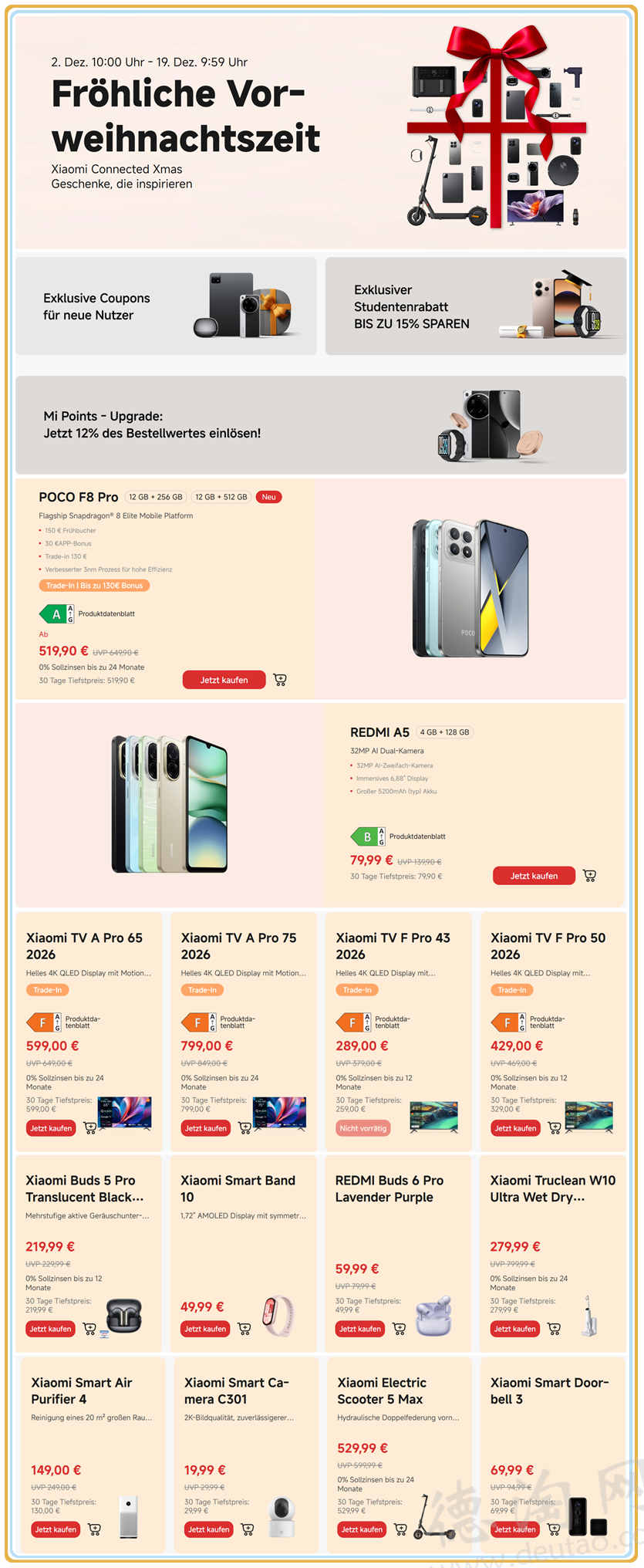 【米子你这次这么卷的吗?Xiaomi 小米官网 圣诞大促全场低至5折,同价位内无敌的4K电视!电吹风只要9.9欧!超强降噪REDMI Buds 6 Pro让预算有限的人也能享有更好的耳机!圣诞好礼~🎁】定位“科技为人”的创新品牌。旗下产品涵盖智能手机、平板电脑、智能家居生态链等,透过高性能与高性价比迅速赢得全球消费者信赖。优惠涵盖手机、平板、智能家居等核心产品。从扫地机器人、智能音箱、摄像头到照明系统,全屋智能预算首选。让科技给你的生活焕新!