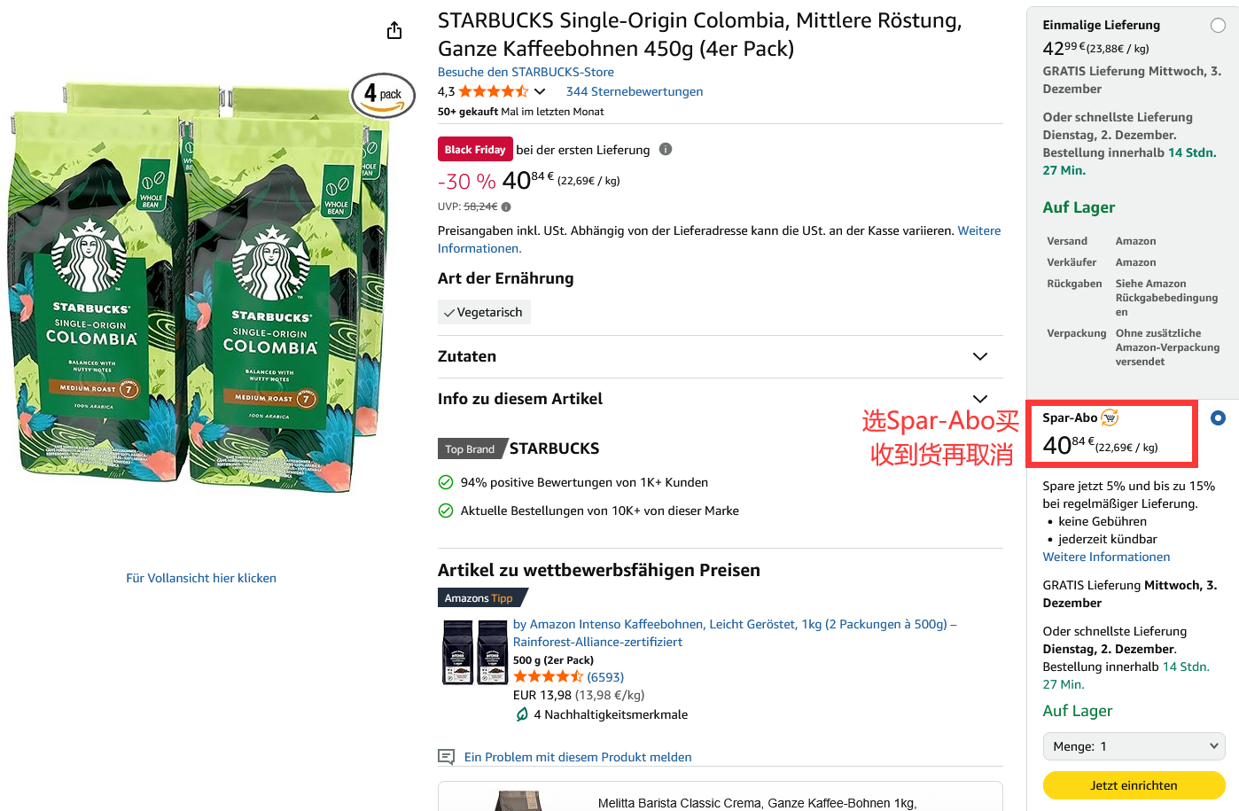 【STARBUCKS 星巴克咖啡豆 4x450g大包装 黑五特价仅40欧!】推荐用Spar-Abo买,叠加Primeday优惠,简直太划算了!!!星巴克的咖啡豆放入咖啡机里,在家也能喝到星巴克咖啡啦~记得买完收到货以后取消Spar-Abo,小编每次都这么操作,没有任何问题~该薅的羊毛还是要薅起来~~~
