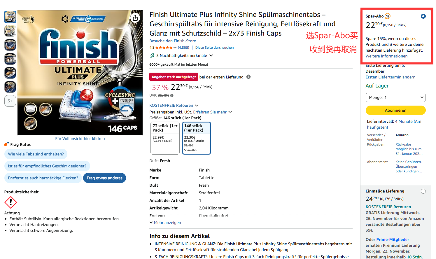 【Finish Ultimate Plus Infinity Shine洗碗机片146粒 黑五特价仅22欧!一次洗涤只要0.15欧!!!】