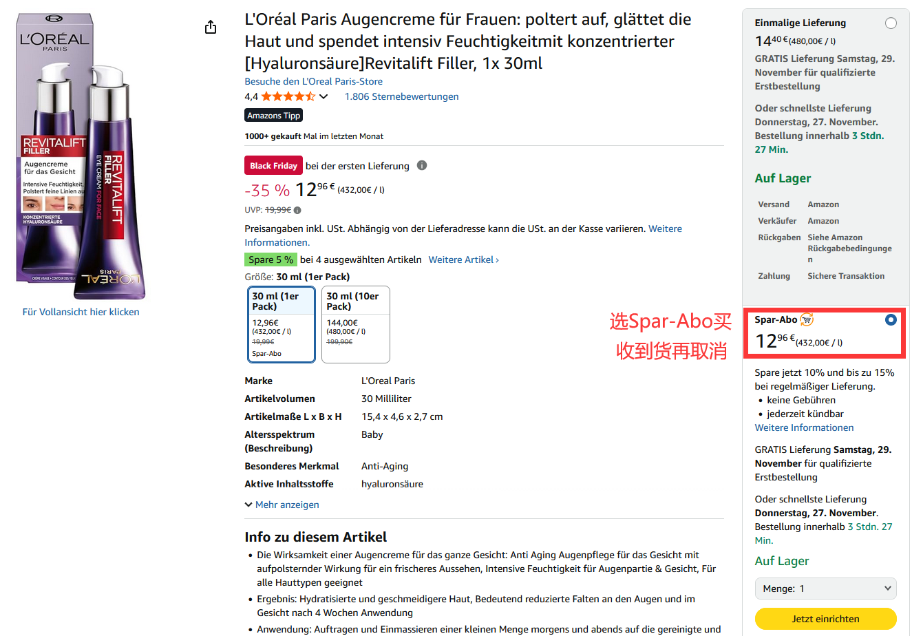 【 L’Oréal 欧莱雅紫熨斗眼霜 #30ml德国版 黑五特价仅12欧!】专门针对上班长时间面对电脑,下班后一直看手机,作息不规律熬夜等导致的眼周干纹,细纹,黑眼圈浮现和泪沟明显等!欧莱雅玻尿酸导入眼霜,使用高浓度微分子玻尿酸,有效抗击初老,抚平细纹!具有保湿和初步抗衰的功效,而且能够有效改善黑眼圈,提拉紧致眼部肌肤,适合轻熟年龄的人群,可以满足初步抗衰老的需求,成分很温和对眼部没有刺激性。