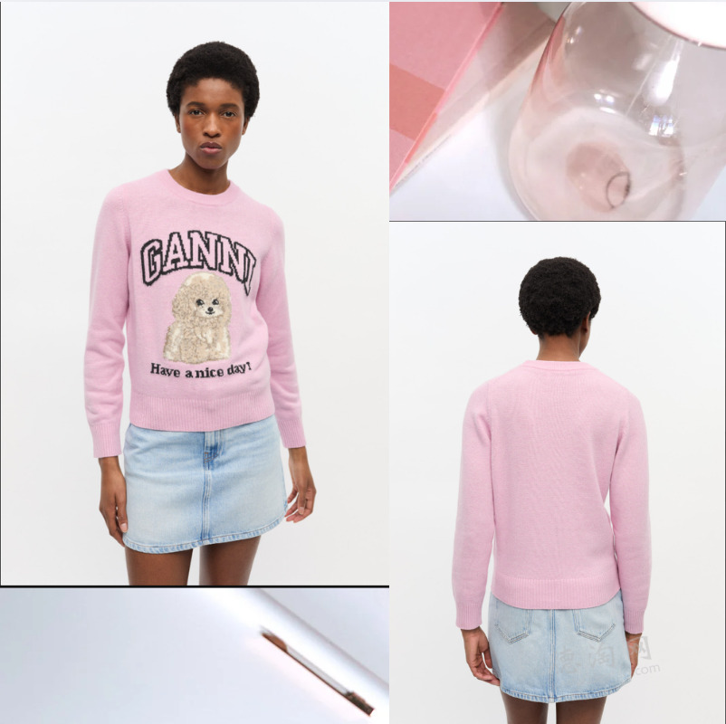 ❤【Ganni Rosa Poodle粉色小狗毛衣 黑五65折仅191欧!】 令人心动的腮红粉色,正面点缀可爱小贵宾图案,配上 “Have a nice day! Please recycle!” 趣味标语,甜美俏皮感满分。45%羊毛+35%再生羊毛+20%再生聚酰胺,柔软保暖同时兼顾可持续理念。无论单穿打造温暖日常,还是叠穿衬衫、半裙或外套,都能轻松切换甜美学院风与街头俏皮感,是冬季衣橱里的趣味心机单品。