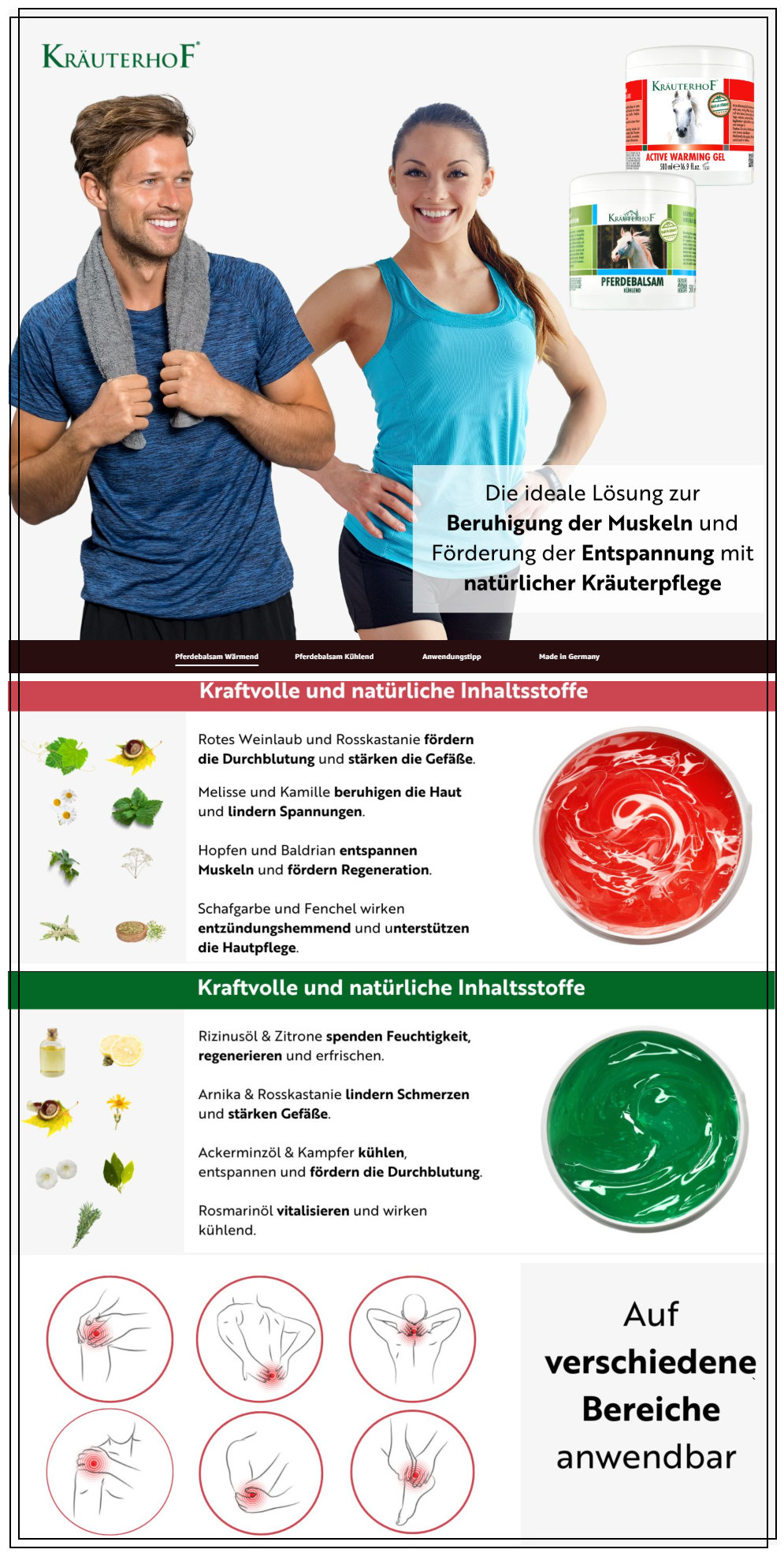 【一套解决关节烦恼!Kräuterhof 德国草本马膏护理套装(冷热款)2x500ml 特价仅13欧!!!】Kräuterhof草本马膏套装,结合 冷感+热感双重护理配方,适用于缓解肌肉酸痛、放松关节僵硬、促进血液循环,特别适合运动后恢复、长时间坐立或年长人群日常使用。红罐是热感马膏,含天然樟脑+香蜂草提取物,强效加热,促进血液循环,缓解背部、肩颈、关节等部位紧绷与疼痛,适合秋冬、睡前或剧烈运动后使用。蓝罐是冷感马膏,含薄荷醇+樟脑+迷迭香油,冰凉舒缓,舒解肌肉紧张,帮助消肿、恢复活力,夏季清爽,运动后按摩首选。